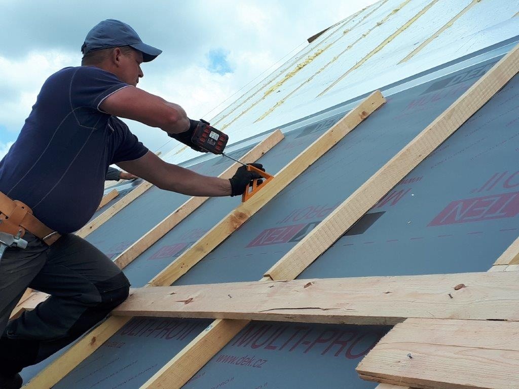 Současně s položením tepelné izolace z PIR desek se prováděla montáž doplňkové hydroizolační vrstvy z difuzní folie DEKTEN MULTI-PRO II a také kontralatí o výšce 60 mm. Tloušťka vzduchové mezery byla 60 mm s ohledem na plechovou krytinu. Kontralatě, a tím i skladba střechy, se přikotvily vruty TOPDEK ASSY do příčné „krokve“ (Foto 8). Kontralať byla dělena na délky 1,35 m dle šířky difuzní folie, na každý úsek dle výpočtu připadly 2 kolmé a jeden šikmý vrut. Pro zvýšení těsnosti systému byly použity těsnící pásky pod kontralať DEKTAPE KONTRA.