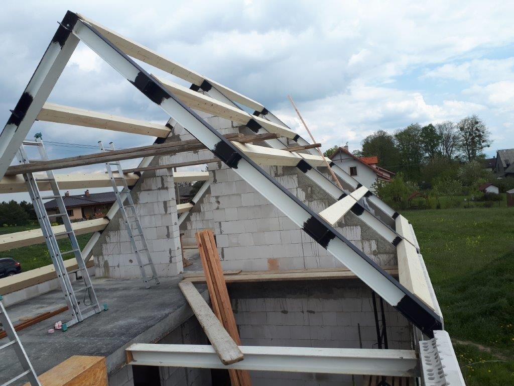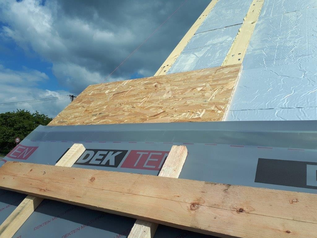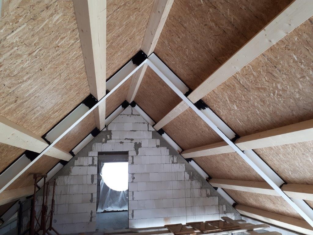 Na provedenou parozábranu se prováděla montáž příčné „krokve“ z KVH profilu. Rozteč těchto krokví byla zvolena dle rozměru PIR desky 800 mm (třetina z 2400 mm). Pomocí této krokve byl proveden i přesah střechy u okapu. Mezi příčné „krokve“ byla položena první vrstva tepelné izolace TOPDEK 022 PIR v tl. 140 mm (Foto 5). Následně byla provedena pokládka souvislé druhé vrstvy PIR v tl. 100 mm, rovnoběžně s okapem (Foto 6). Desky jsou spojovány na pero a drážku, malé netěsnosti jsou dopěněny nízkoexpanzní PU pěnou. Štítový přesah střechy je tvořen vysunutím OSB desky (Foto 7).