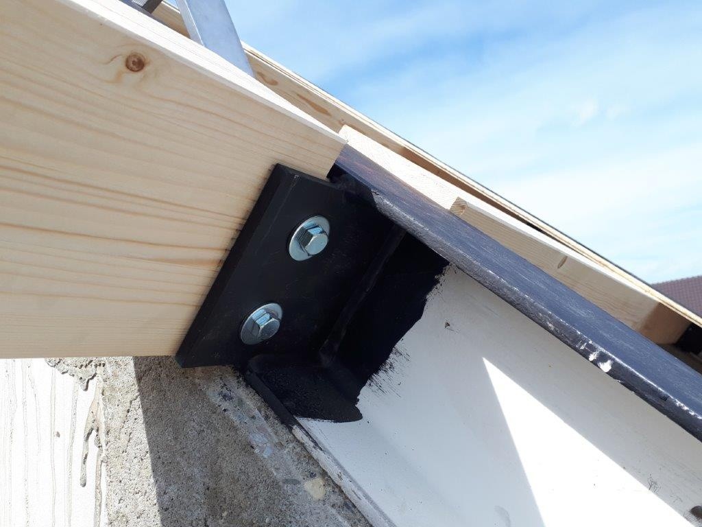 Krokve „po vlašsku“ jsou upevněny ve vzdálenosti cca 1,2 m do ocelové rámové konstrukce z HEB profilů (Foto 1 a 2). Aby bylo možné pro upevnění střešní skladby využít obvyklé zásady pro upevňování nadkrokevní skladby, bylo navrženo vložení příčných KVH hranolů („falešných krokví“) do spodní vrstvy tepelné izolace. Hranoly byly připevněny k vlašským krokvím. Kotvení se pak navrhovalo dle umístění stavby (větrová a sněhová oblast) s pomocí výpočetního postupu pro klasický systém TOPDEK. Bylo navrženo kotvení pomocí 2 kolmých a 1 šikmého vrutu (Obr. 4 a 5) na délku kontralatě 1,35 m (úsek kontralatě odpovídá šířce difuzní folie pokládané rovnoběžně s okapem). Firma dostala kompletní specifikaci upevňovacích prvků.
