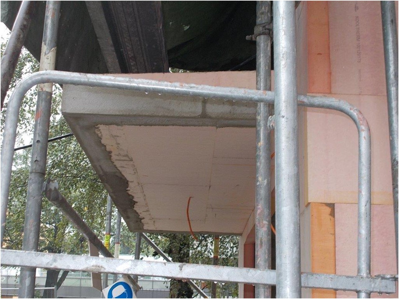 V prvním kroku došlo k plošnému oklepání staré břizolitové omítky. Obvodové cihelné zdivo bylo následně zbaveno nečistot, mastnoty a všech volně se oddělujících vrstev, případně materiálů, které se rozpouští ve vodě (obr. 3, 4). Jelikož povrch izolačních desek Kingspan KOOLTHERM K5 nelze dodatečně upravovat broušením, bylo nutné věnovat zvýšenou pozornost rovinnosti podkladu. Nerovnosti větší než 10 mm/m bylo doporučeno vyrovnat cementovou maltou. Z důvodu zvýšení přídržnosti a snížení savosti podkladu byl podklad ošetřen penetrací.