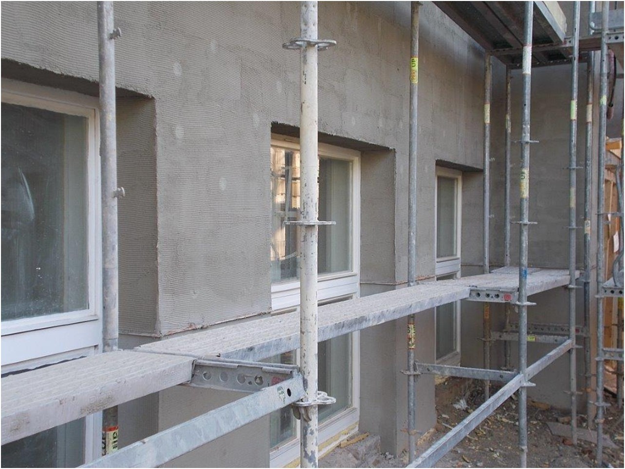 Na přikotvené tepelněizolační desky se nanesla zakladní vrstva v minimální tloušťce 4 mm, vyztužena byla skleněnou tkaninou (přesahy tkaniny minimálně 100 mm) a následně překryta stěrkovou hmotou. Základní vrstva se prováděla v jednom kroku. Celková tloušťka základní vrstvy musí být minimálně 5 mm a maximálně 7 mm. Finální povrch základní vrstvy se upravil zubovým hladítkem. Pro lepší přilnavost a zpracovatelnost břízolitové omítky se provedlo vodorovné zubování základní vrstvy (obr. 8).