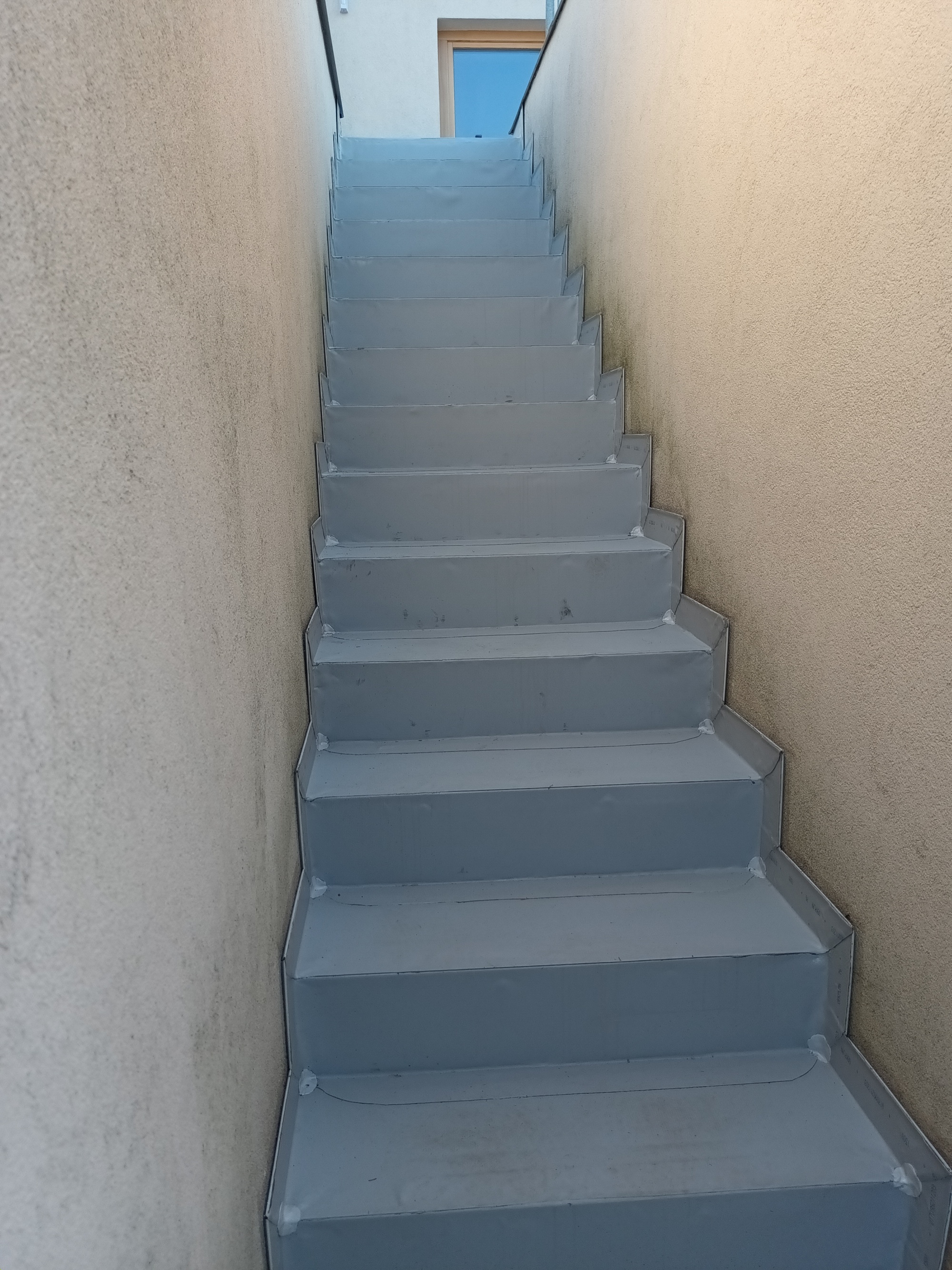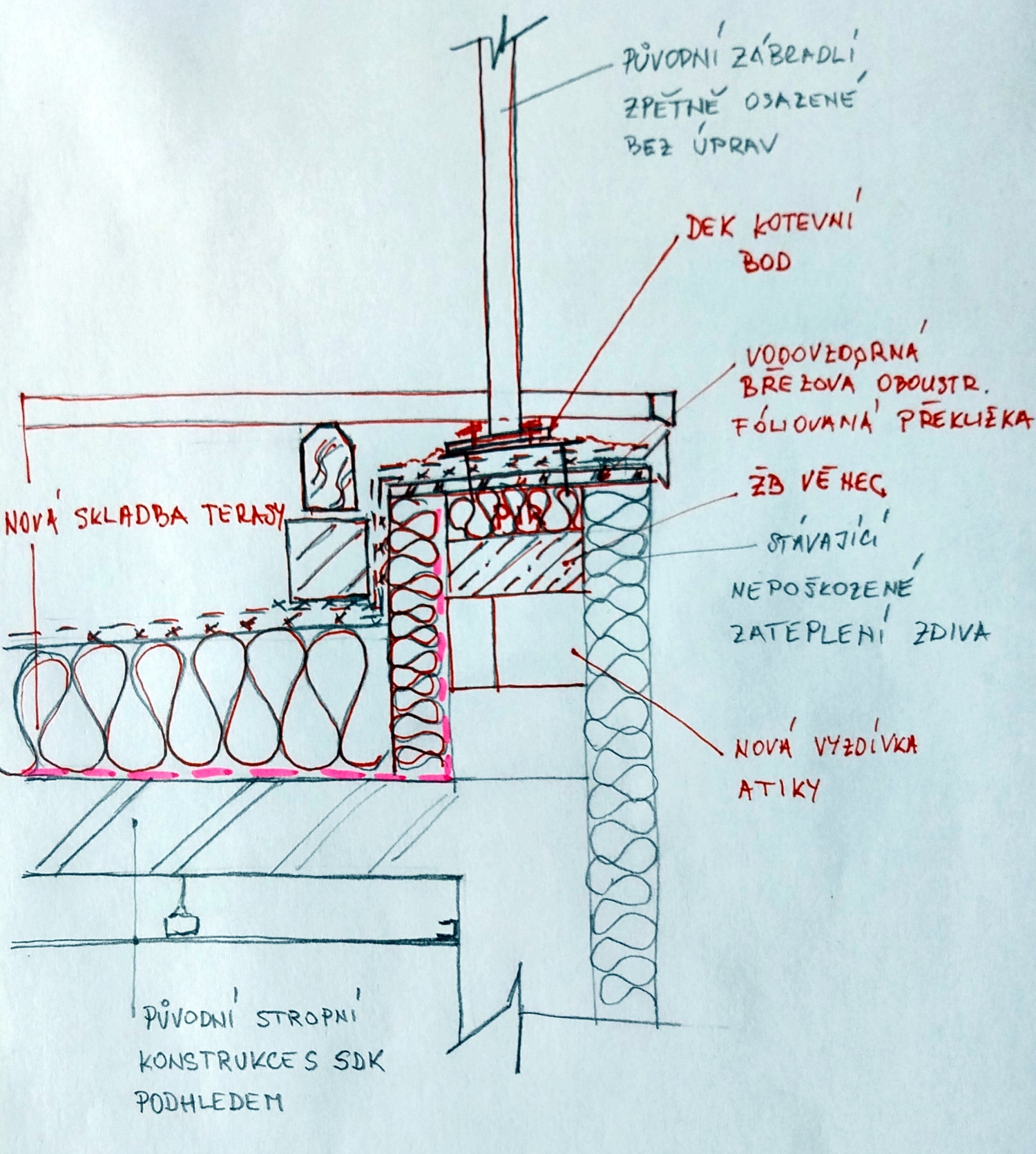 Investor požadoval vrátit stávající pozinkované zábradlí a osadit je do stejné výšky, v jaké bylo osazeno před rekonstrukcí. Tato výšková návaznost byla po celou dobu rekonstrukce jedním ze sledovaných parametrů rekonstrukce. Konstrukce zábradlí totiž výškově navazovala na konstrukci zděné plné atiky, respektive zábradlí k sousedovi (pro neprůhledné oddělení v řadové zástavbě). Změny v těchto výškových návaznostech stávajícího zábradlí, které mělo také zůstat bez úprav, by znamenaly zásahy do navazující fasády domu v 1NP. Tato souvislost je viditelná na obr. 26. Nově provedený detail atiky včetně vodorovného zateplení a vodovzdorné překližky pro kotvení zábradlí je na obrázku 19.