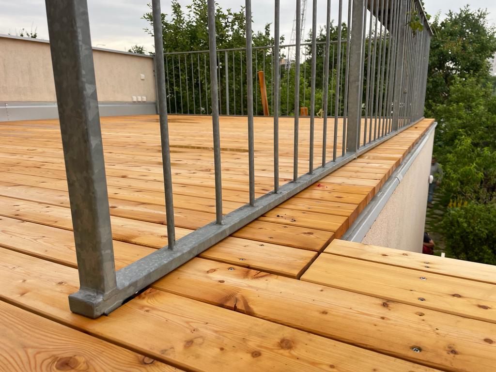 Pro rekonstrukci terasy byla zvolena jednoplášťová skladba odpovídající systémové skladbě DEKROOF 10-A, respektive ST. 3001A. Na požadavek investora byla opět provedena terasa z modřínových prken.