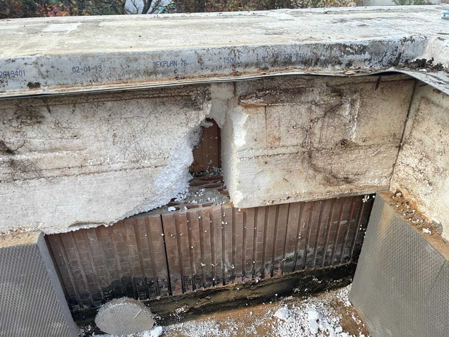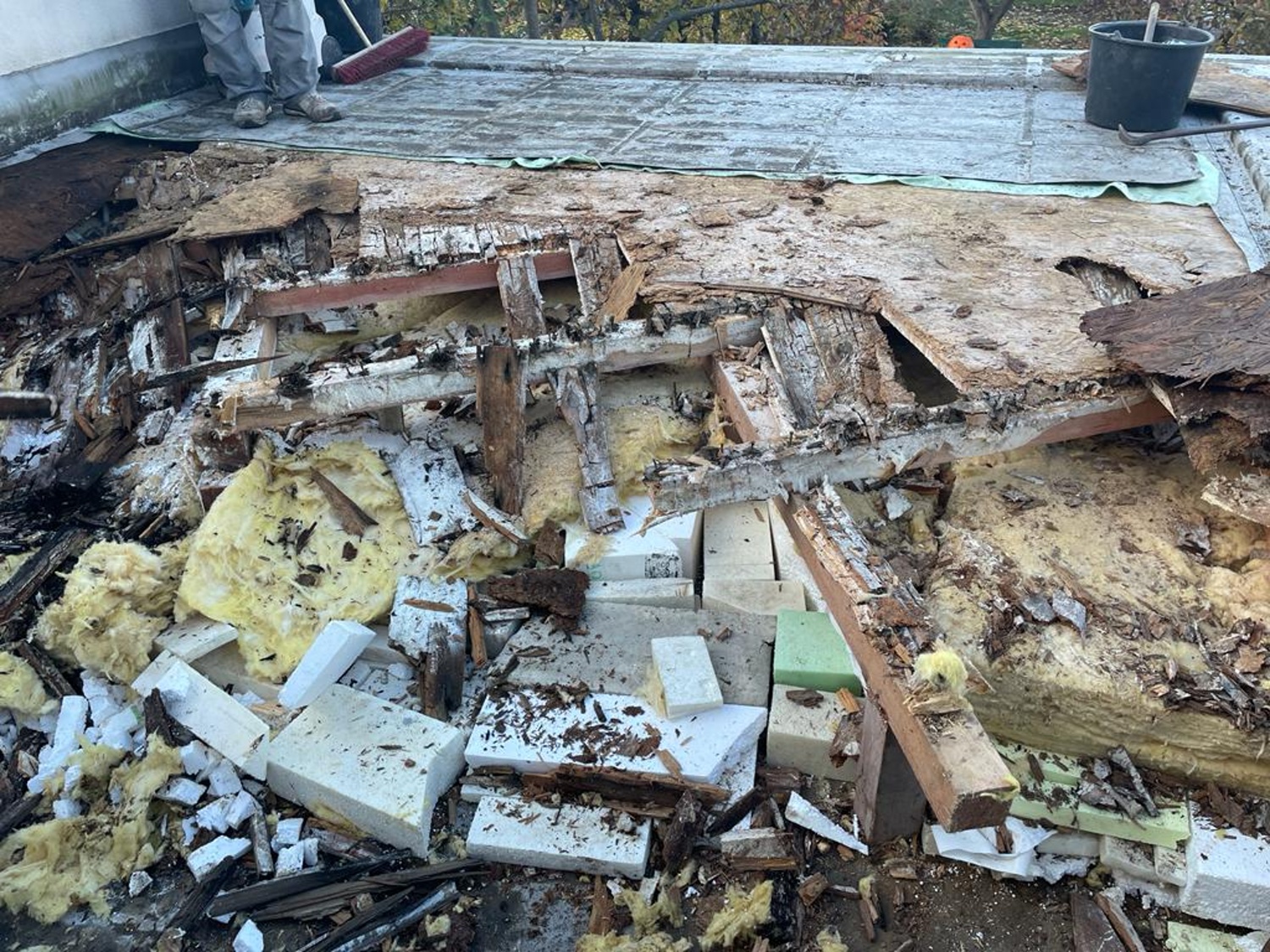 Na střeše ložnice vznikla pobytová terasa se schodištěm navazujícím na zahradu za domem. Terasa se po těch deseti letech dostala do havarijního stavu a do prostor pod ní zatékalo. Již při první prohlídce byly zjištěny nesprávně řešené detaily napojení hydroizolační fólie na navazující stěny a na atiku. Bylo velmi pravděpodobné, že jsou příčinou zatékání do interiéru. Dalším problematickým místem bylo kotvení zábradlí do koruny atiky. Podívejme se na fotografie z průzkumu a z následující demontáže terasy.
