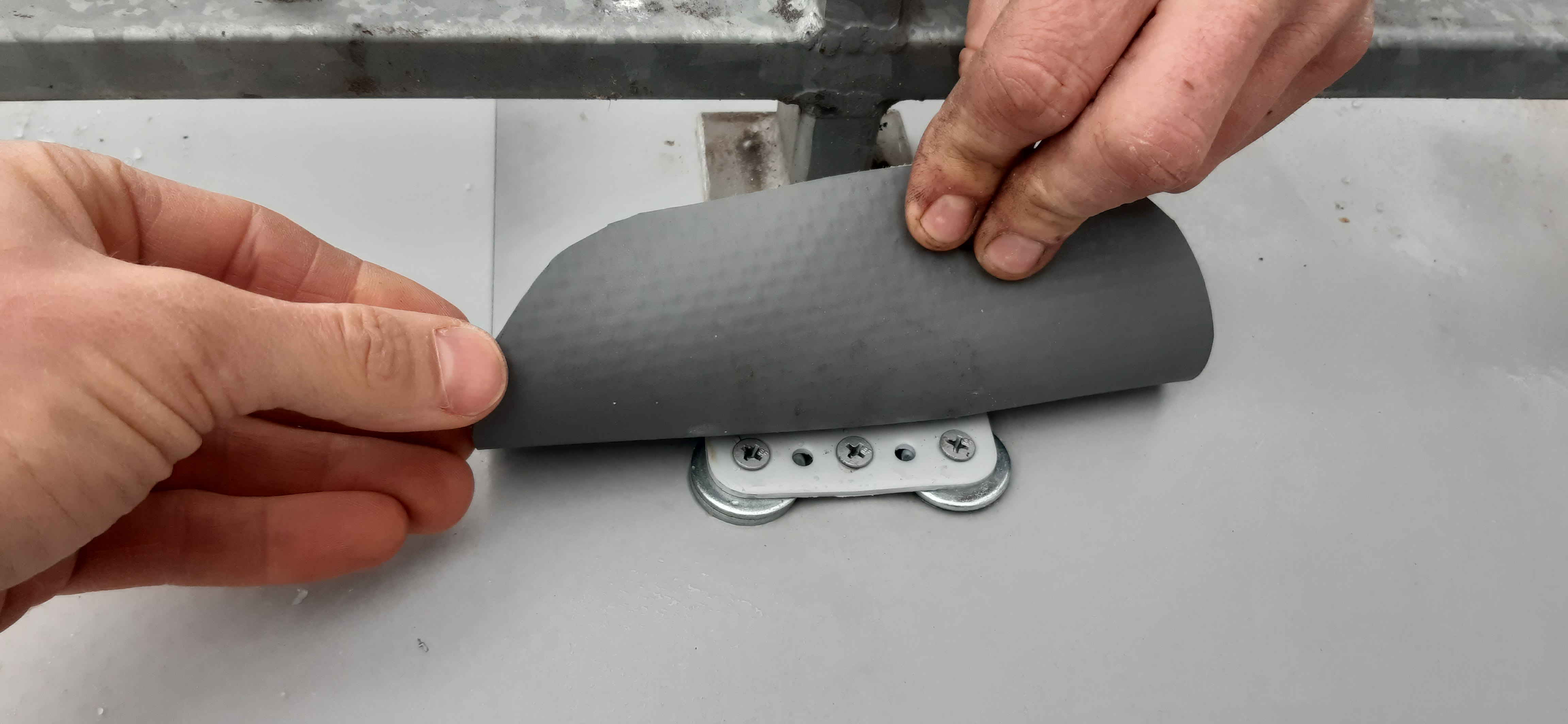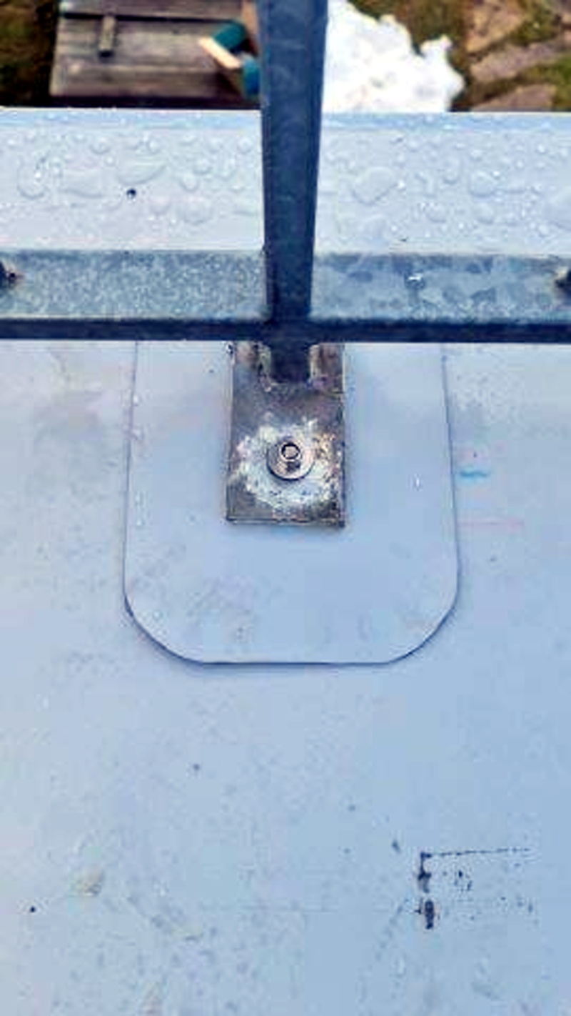 Vzhledem k tomu, že původní kotvení zábradlí přes ocelové plotny do atiky skrz oplechování či hydroizolační fólii bylo jedním ze zdrojů zatékání do skladby střechy, byla tomuto detailu věnována nemalá pozornost. Investor odsouhlasil použití výrobku DEK kotevní bod vyvinutého v centru výzkumu a vývoje DERIC tak, aby kotevní šroub pro připevnění různého příslušenství byl vodotěsně spojen s fóliovou hydroizolací. V našem případě bude tím příslušenstvím střechy pozinkovaná kotevní patka zábradlí.
