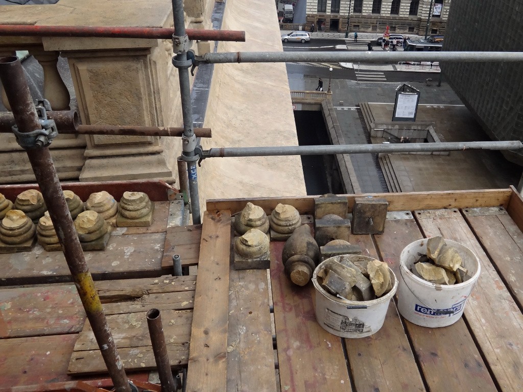Spolu s korunní římsou byla také opravena celá balustráda. Původní kuželky balustrády byly vyrobeny z pískovce těženého u Hořic v Podkrkonoší. Na všechny nynější opravy se používal Božanovský pískovec. Je tvrdší, ale bělejší, proto se musel dopatinovat (foto 23, 24).