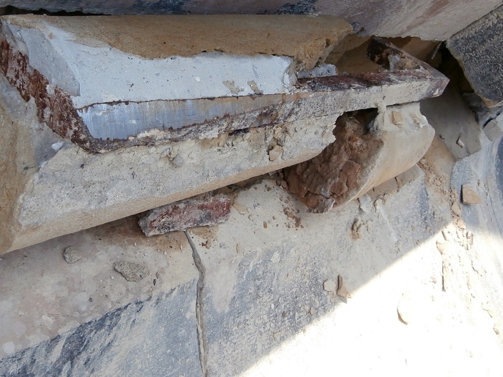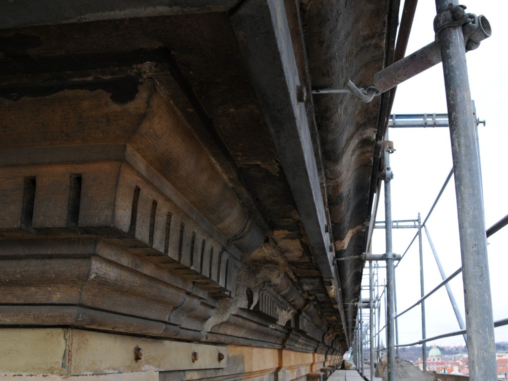 Oprava poruch korunní římsy způsobených korozí železných spon