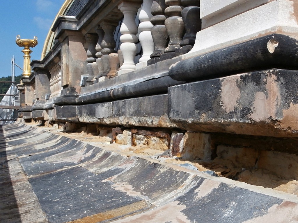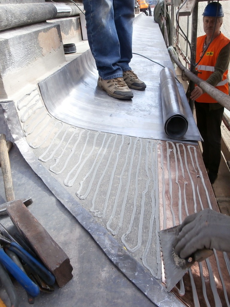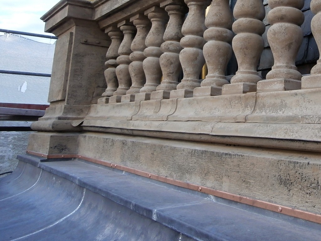 Celá sanovaná korunní římsa se zabalila do olověného oplechování (cca 3 mm), které se k podkladu lepilo. Tento postup byl zvolen pro spolehlivou ochranu římsy nepřístupné pro kontrolu a údržbu před pronikáním vody. Národní památkový ústav nadřadil požadavek na spolehlivou ochranu před vodou nad přísnou památkovou ochranu a povolil realizaci této nepůvodní technologie. Římsa sice není pohledová, ale i tak se provedla patinace její vrchní části. Současně se také provedlo nové oplechování zaatikového žlabu měděnou výstelkou, kde muselo dojít k napojení na ponechané olověné pásy pod kuželkami balustrád (foto 16, 17, 18, 19).
