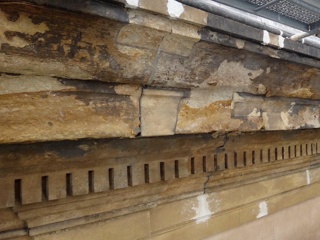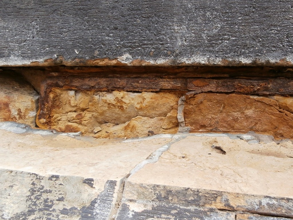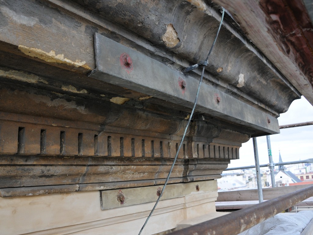 Oprava oblastí korunní římsy s železnými sponami, kde dosud nedošlo k separaci částí římsy