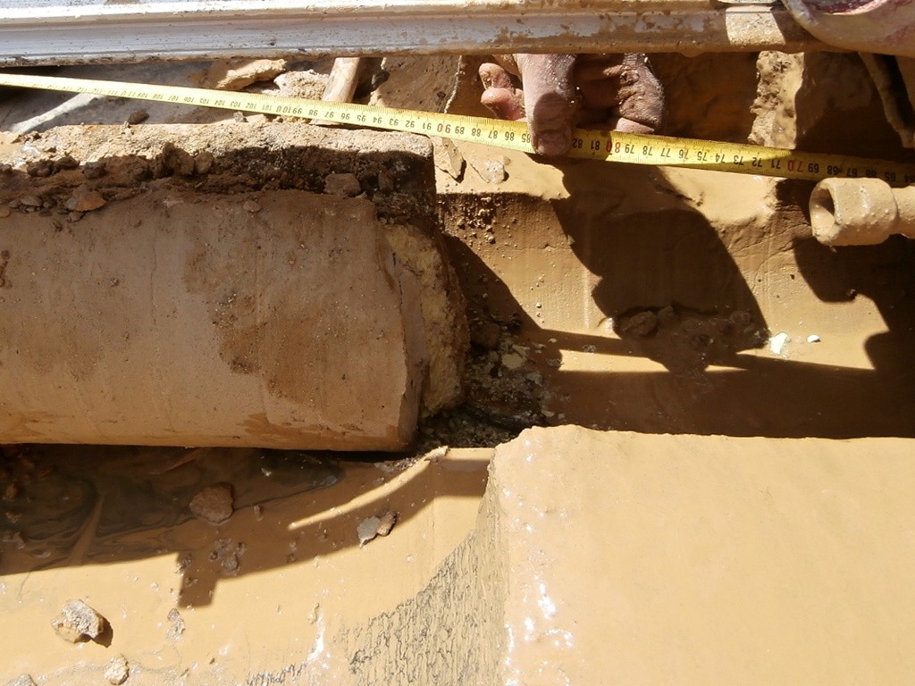 Detektor nikde nic nenašel. Začalo se uvažovat, že se ocelová konstrukce pouze odřízne do hloubky cca 100 mm, aplikuje se inhibitor koroze, vloží se kamenná plomba a bude hotovo. Poté jsme zkusili trochu zapáčit za vyčnívající závit, a co se nestalo - ocelová kulatina se závitem na konci se nechala bez většího odporu vytáhnout z otvoru. Byla pouze vložena do předem vyvrtané díry opatřené cementovou kaší. Byla to opravdu náhoda, takto vytáhnout šla pouze jedna tyč. Ale napomohlo to k rozhodování, jak odstranit Fantyšův roh. Ostatní tyče se odstranily jádrovými vrty (foto 12, 13).