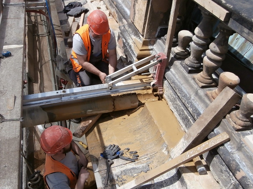 Nejprve se odvrtaly všechny zkorodované kramle, které byly viditelné po odebrání uvolněných pískovcových bloků ze spodní strany korunní římsy (foto 1, 2, 3). Následně se detektory kovů zjišťovaly polohy zbývajících kramlí a prováděly se další jádrové vrty (foto 4, 5, 6, 7, 8). Po odvrtání byl vytažen válec pískovce i s kramlí. V díře se udělal kamenný výdusek, a následně se provádělo statické zajištění nerezovými a sklolaminátovými tyčemi.