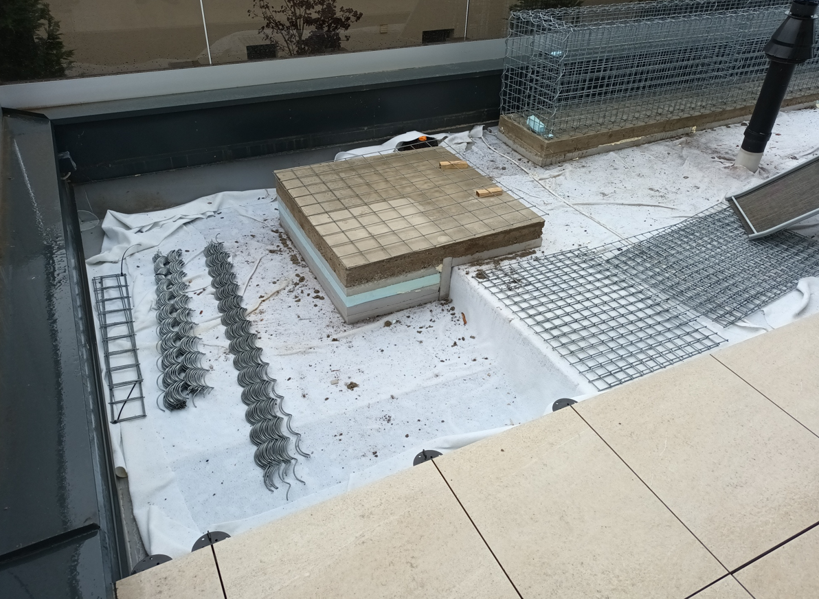 Na části plochy zůstala keramická dlažba na rektifikovatelných terčích, která sloužila dále pro pochůznost části střechy.