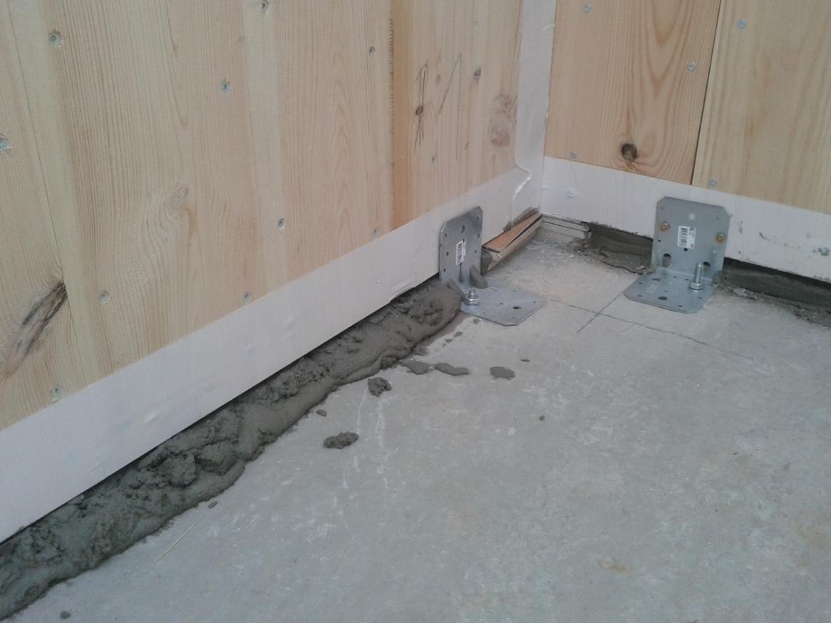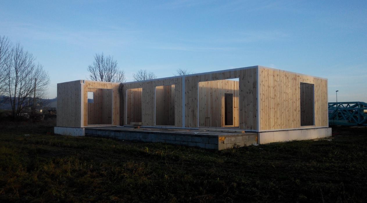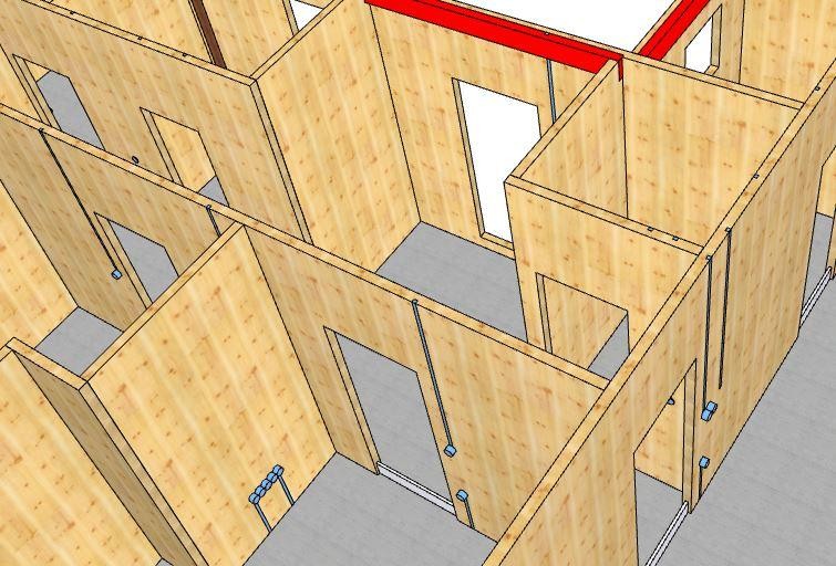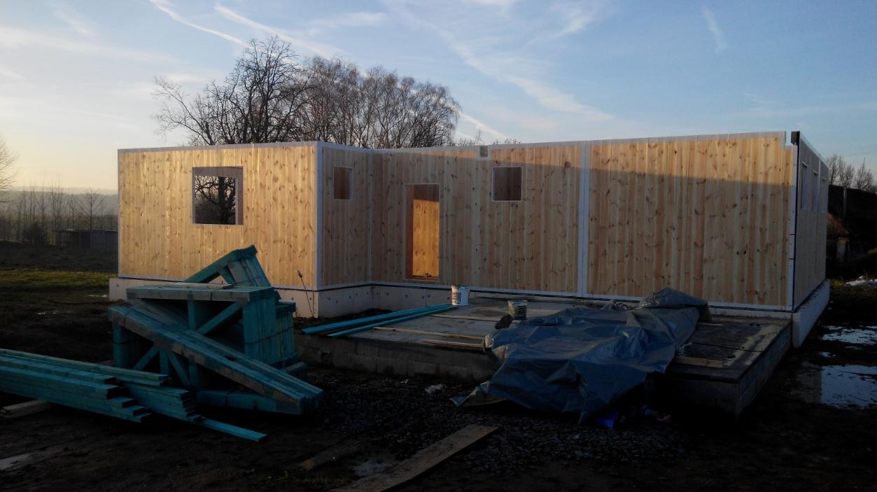 Následovala montáž hrubé stavby vybranou realizační firmou. Na připravené základy, opatřené shora hydroizolací a ochrannou betonovou mazaninou se nejprve vytyčila poloha budoucích stěn a osadily se ocelové úhelníky. Úhelníky se osazují vždy pouze z jedné strany panelu a ukotví se obvykle nejprve jednou průvlakovou kotvou do podkladu. Úhelníky se osazují minimálně 200 mm od konce panelů, popř. otvorů v panelech.