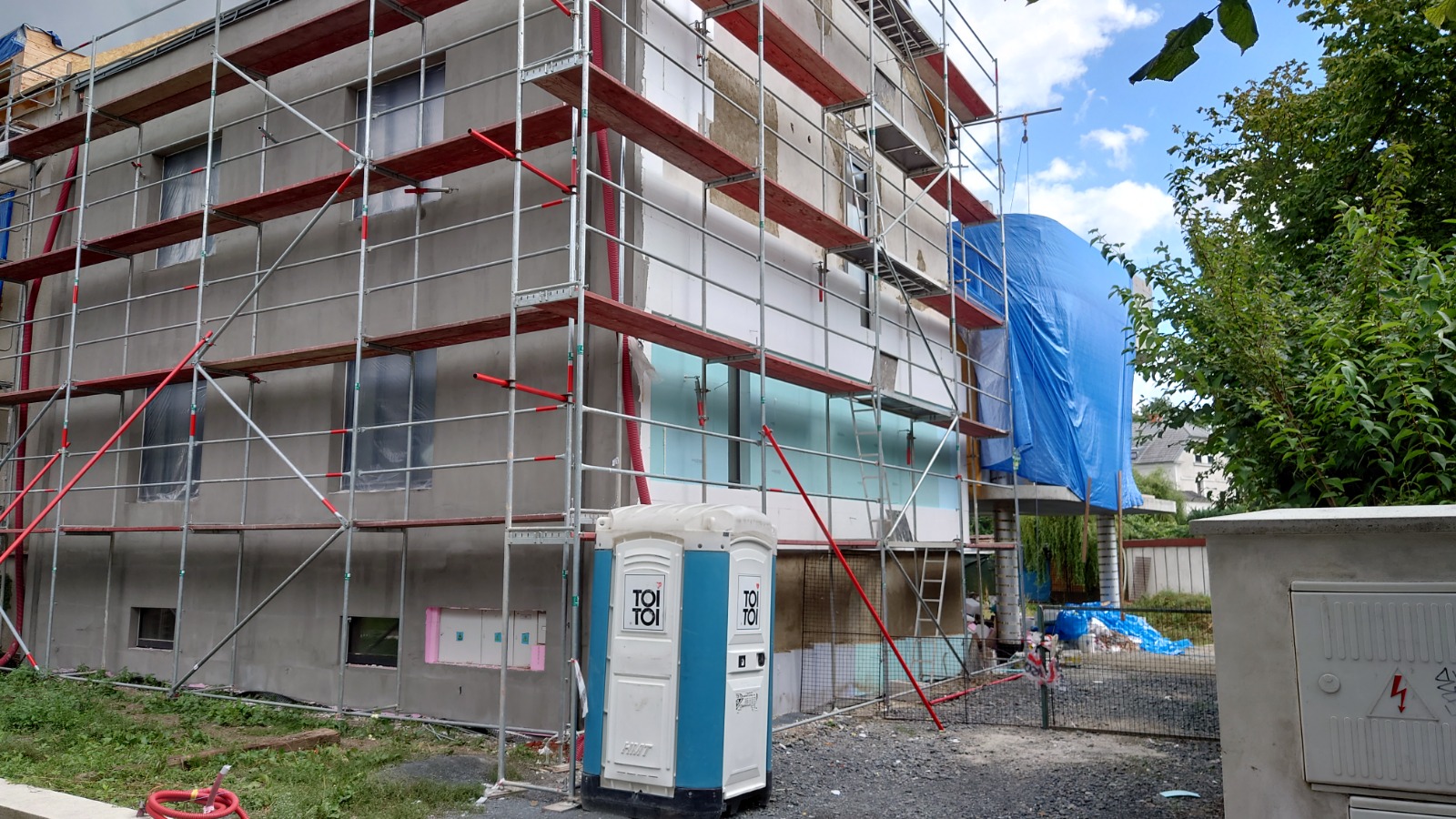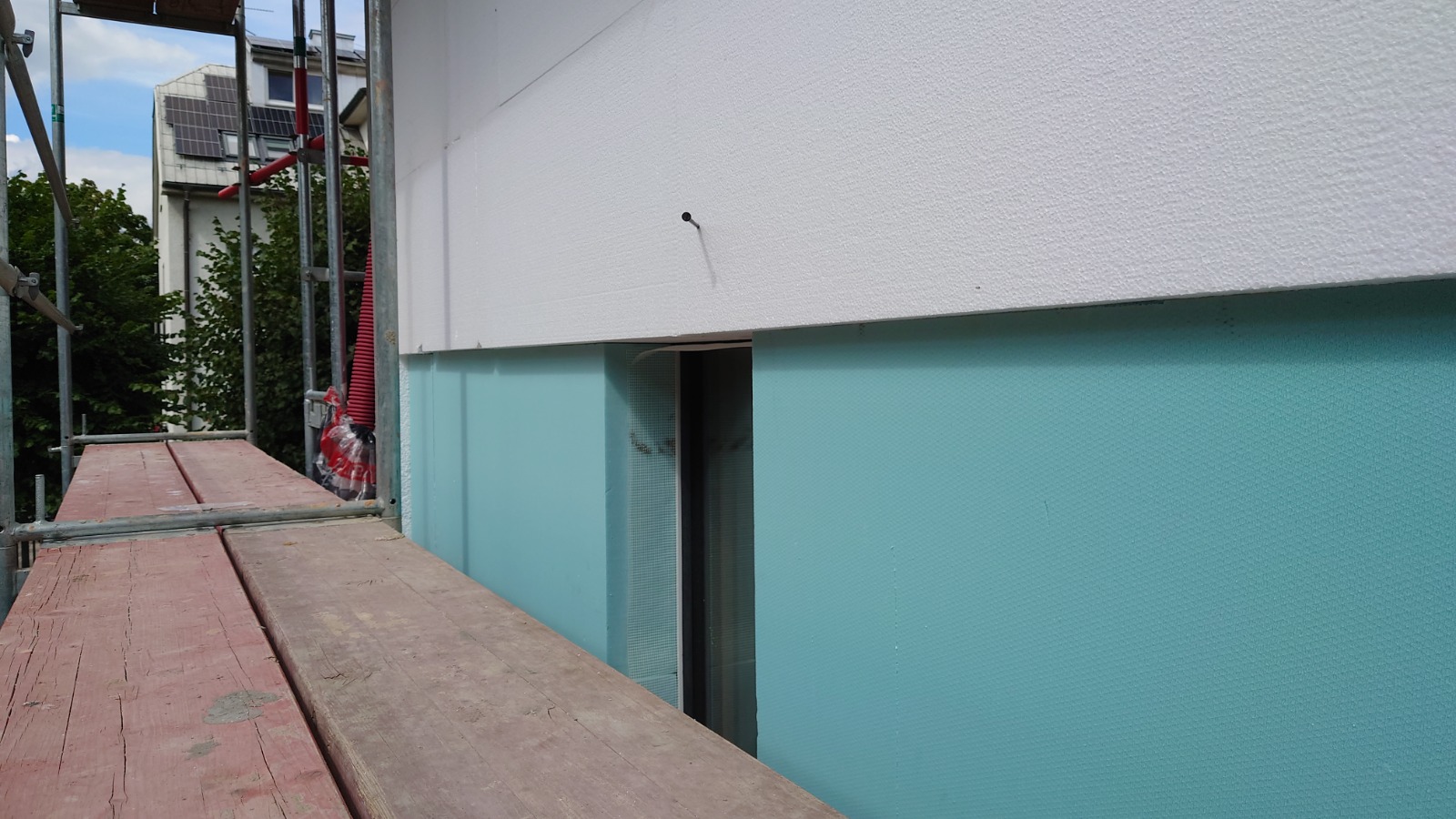 Na fotografiích z realizace zateplení je více vidět skutečné provedení zateplení. Okna byla osazena s vnějším povrchem omítky obvodové stěny. Byl zde architektonický požadavek na zapuštění povrchu fasády mezi okny. Kvůli menší tloušťce tepelné izolace bylo v tomto místě navrženo zateplení izolantem XPS tl. 130 mm místo bílého fasádního polystyrenu EPS 70F tl. 180 mm, který byl v celé další ploše fasády. Vzniklý odskok 50 mm byl opatřen plechovým parapetem, který byl na základní vrstvu s výztužnou tkaninou nalepen PU tmelem.