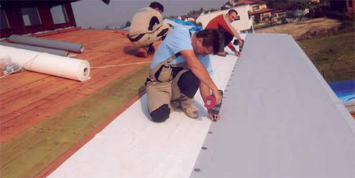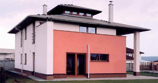 Nad půdorysem rodinného domu o rozměrech 11×11 m byla navržena šikmá střecha stanového tvaru se středovou věží. Na krytinu byla užita fólie z měkčeného PVC (obr. 01). Po šest let od realizace střecha neměla zjevné vady.