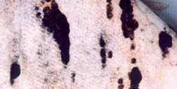 b) Podkladní textilie byla mokrá (36 % vody hmotnostně) do její struktury vrůstala z podkladu houba (obr. 05).