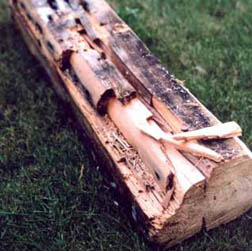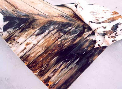 c) Dřevěné bednění nalezeno rovněž mokré (46 % vody hmotnostně), rozložené biologickou destrukcí (obr. 06). Dřevo bylo možno rozebírat rukou (obr. 07).