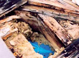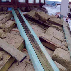d) Také nosná dřevěná konstrukce krovu nalezena mokrá, poškozená dřevokaznou houbou, později identifikovanou jako koniofora sklepní (obr. 08).
