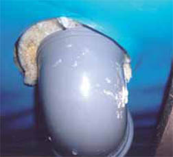 f) Pod tepelnou izolací nalezena foliová parotěsná zábrana (obr. 10). Její napojení na stěnové konstrukce nebylo dokonalé (obr. 11), u některých prostupů potrubí napojení zcela chybělo (obr. 12).