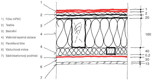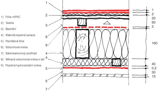 Schéma navržené a realizované skladby střechy je zachyceno na obr. 13. Použitou konstrukci lze charakterizovat jako jednoplášťovou nevětranou šikmou střechu s podhledem.