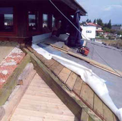 Stav střechy si vynutil její rekonstrukci. Při rozkryvu se potvrdila plošná destrukce dřevěné konstrukce, a to zejména v horních partiích střechy a v oblasti nároží (obr. 14). Prkna byla nalezena rozložená v celém profilu (obr. 15), krokve v horní části (obr. 16).