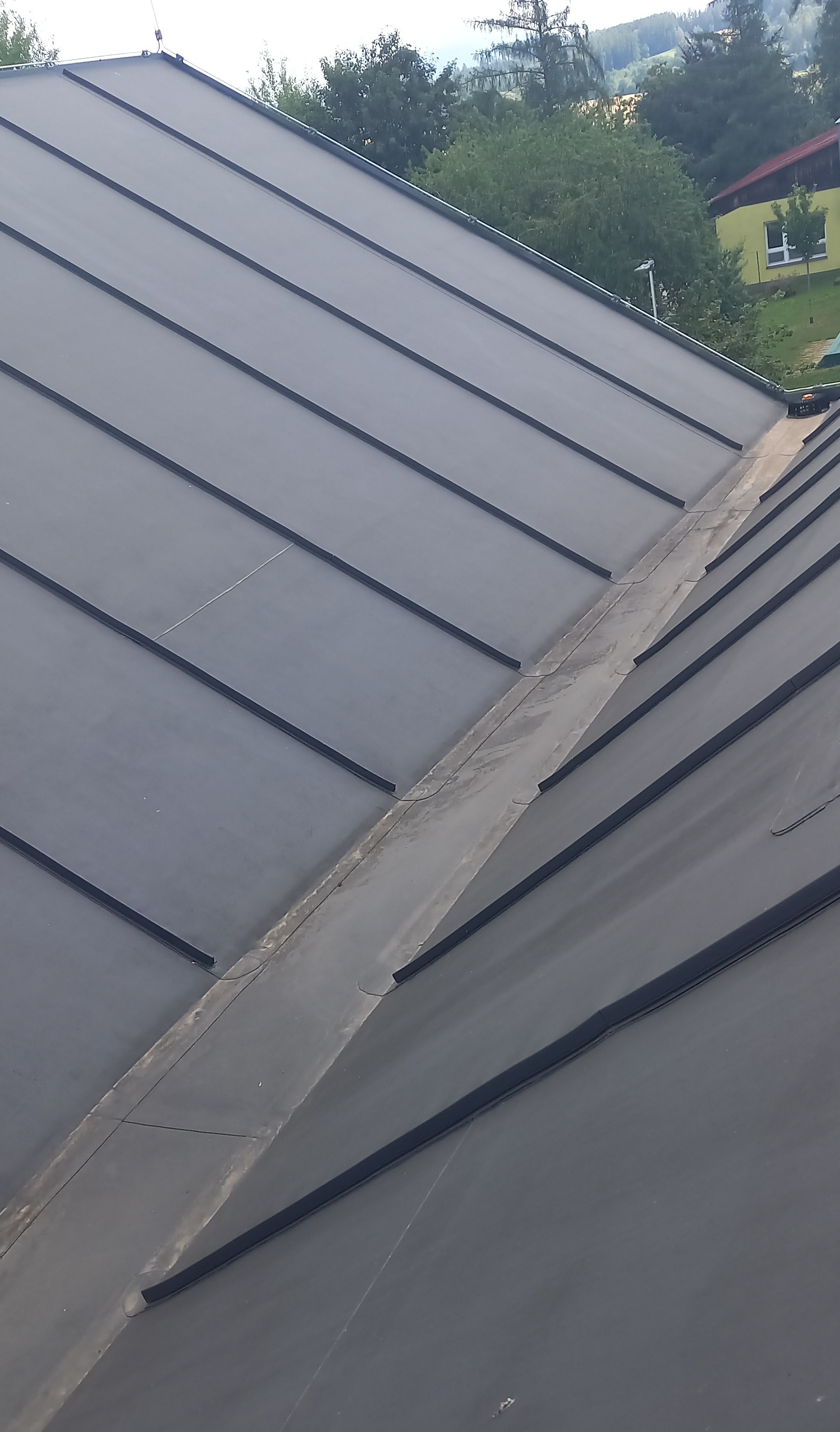 Po zvážení všech výše zmíněných úskalí a zároveň při zachování architektonické koncepce stavby jsme doporučili střechu řešit jako jednoplášťovou nevětranou s tepelnou izolací umístěnou nad krokvemi. Jako hlavní hydroizolace byla zvolena svařovaná hydroizolační PVC-P fólie ALKORPLAN 35276 v barvě antracit doplněná o profily ALKORDESIGN imitující stojatou drážku, která je typická pro vzhled plechové falcované krytiny. Toto řešení umožnilo střechu řešit bez nutnosti větrání, bez složitých konstrukčních detailů a s vysokou hydroizolační bezpečností. Zároveň byla zachována i estetická funkce, neboť na první pohled není poznat, že se nejedná o plechovou krytinu.