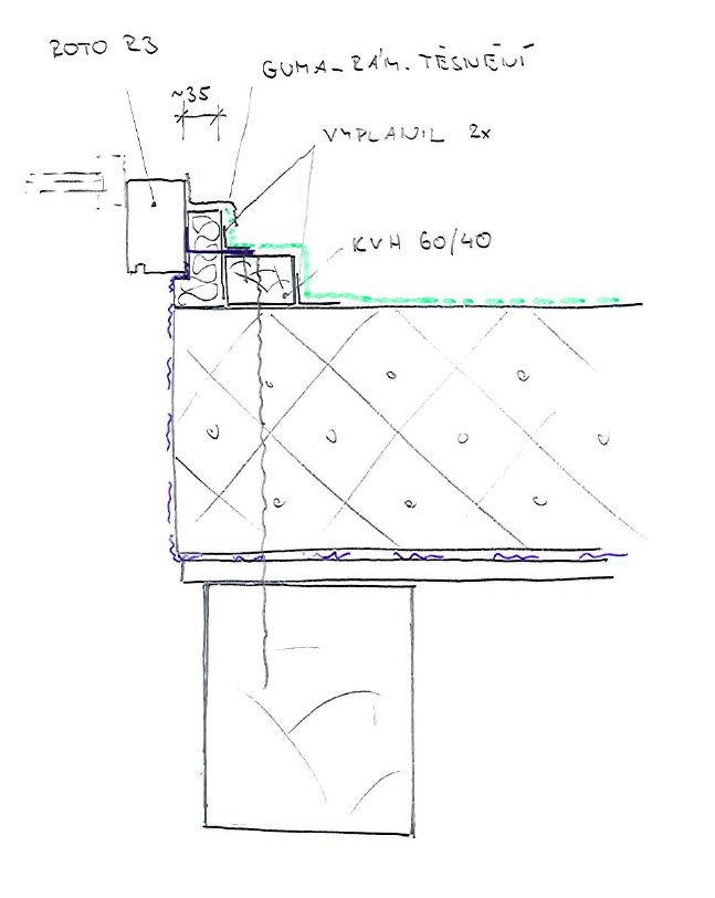 Střešní okna nad schodišťovým prostorem byla v prvním koncepčním návrhu umístěna v těsné blízkosti úžlabí (viz obr. 2). V této poloze byla ale jejich poloha s ohledem na namáhání deštěm a sněhem riziková. Střešní okna tak byla v dalším stupni projektové dokumentace posunuta výše k hřebeni střechy. Během provádění stavby byla nakonec tato okna zrušena úplně a nahrazena jedním světlovodem. K opracování zbyl pouze pod hřebenem střechy výlez z půdního prostoru ROTO WDA R35K WD 540/980 mm. Ten byl spolu se zateplovacím blokem osazen na pomocnou dřevěnou konstrukci.