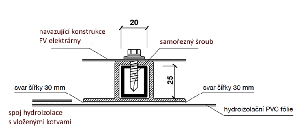 Firma pověřená rekonstrukcí střechy zvažovala více variant prověřených stavební praxí. Plán počítal s doplněním tepelné izolace na stávající konstrukci, její zakrytí doplňkovou hydroizolační vrstvou a realizací laťování pro velkoformátovou skládanou krytinu. Pro stabilizaci FVE bylo uvažováno o použití systémových šroubů s těsnicí podložkou, kotvených skrz velkoformátovou krytinu. V konkrétních podmínkách objektu se však tato varianta ukázala jako nevhodná. Kotvení přes tepelnou izolaci až do relativně tenkého trapézového plechu by komplikovalo skladbu střechy a perforace nové krytiny by představovala riziko z hlediska životnosti a spolehlivosti.
