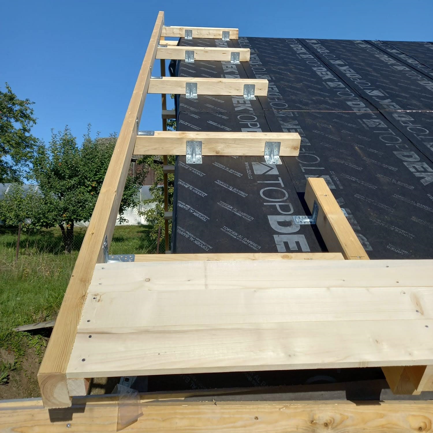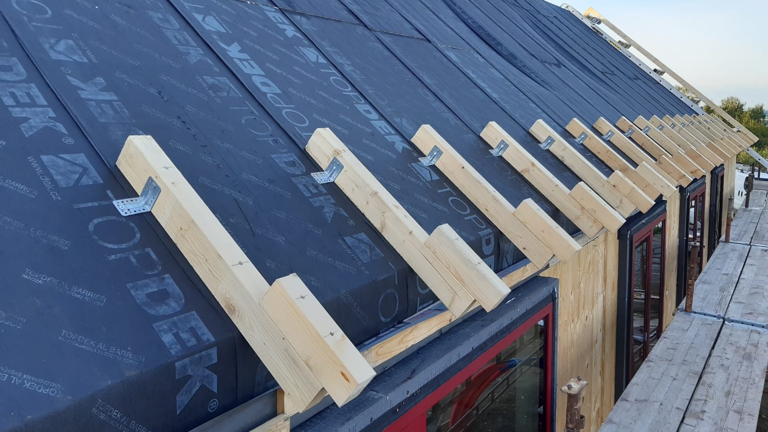 Zajímavým bodem realizace jsou smykové podpory (námětky), které se podílejí na stabilizaci střešní skladby proti sesunutí a zároveň vynášejí okraj střechy do vzdálenosti 420 mm od vnějšího povrchu panelů obvodové stěny. Tato vzdálenost odpovídá celkové tloušťce navržené skladby větrané fasády. Po dokončení fasády přesah střechy zmizí, jediným prvkem přesahujícím přes styk střechy s fasádou po dokončení stavby zůstane přiznaný podokapní žlab. Návrh i realizace námětků byly snazší díky tomu, že nosný panel, do kterého se celá skladba fixuje, je v celé ploše materiálově homogenní. Nebylo nutné brát ohled na přesnou polohu dřevěných krokví nebo ztužujících žeber, jako je tomu při fixaci smykových podpor u systémových skladeb TOPDEK na krovech nebo na keramických či pórobetonových šikmých konstrukcích zmíněných v úvodu článku.