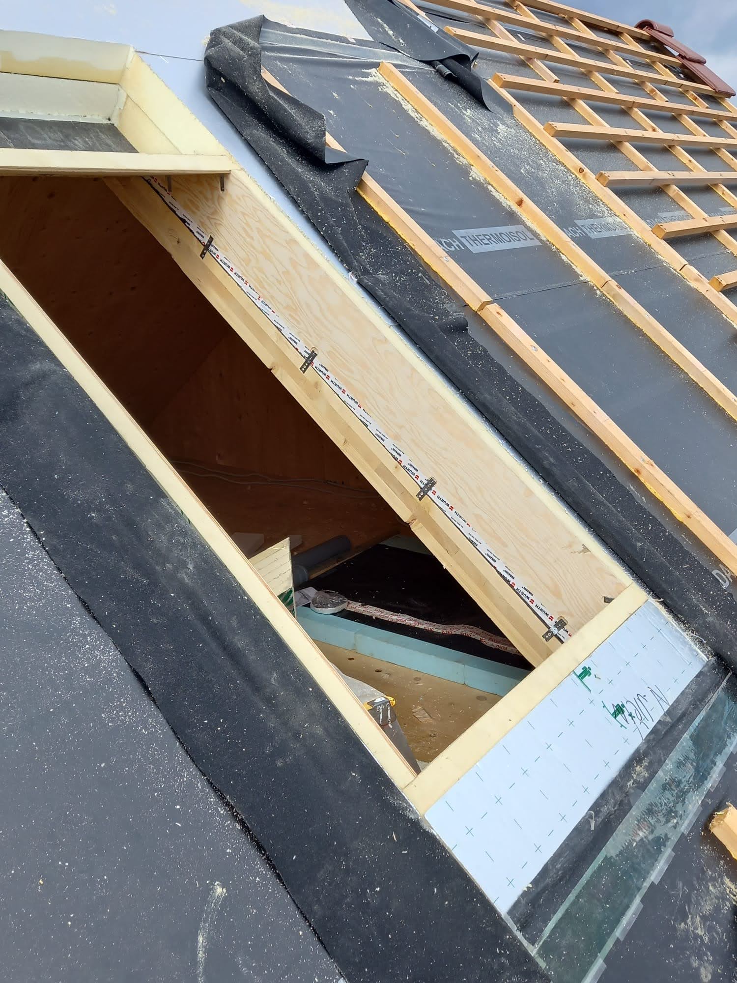 Nedílnou součástí systému TOPDEK jsou okenní dílce pro spolehlivé zabudování střešních oken do skladby šikmé střechy. Na této stavbě sloužily pro vynesení dvou oken ROTO R89G. Zabudování okenních dílců do skladby proběhlo standardním způsobem nad otvory připravenými ve střešních CLT panelech již z výroby (obr. 4).