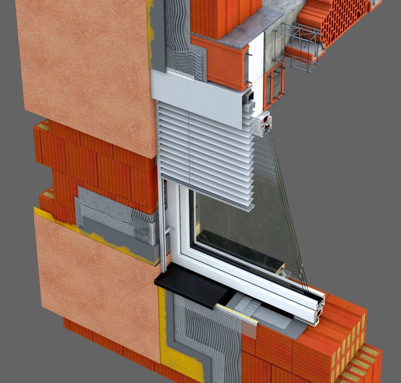 Další skladbou je umístění venkovní žaluzie do skryté schránky ISO-KASTL. Kvůli náročnosti stavební přípravy je nutné pracovat s tímto typem montáže počítat už během projektování. Obvodové zdivo je tvořeno Zdivem Porotherm 25 EKO+ Profi. Tepelnou izolaci konstrukce tvoří EPS tl. 200 mm. ISO-KASL je zabudován v úrovni překladu. ISO-KASTL je zapuštěný do vrstvy tepelné izolace. Proti vzniku nežádoucích trhlin je na přední straně krytu EPS tloušťky 20 mm. V napojení ISO-KASTLU a ETICS doporučujeme klást důraz na vyztužení detailu a použití diagonálně umístěných pruhů výztužné tkaniny. Mezi krytem a překlady je použita izolace XPS tl. 60 mm.