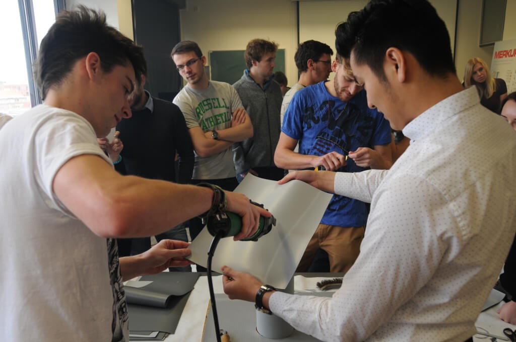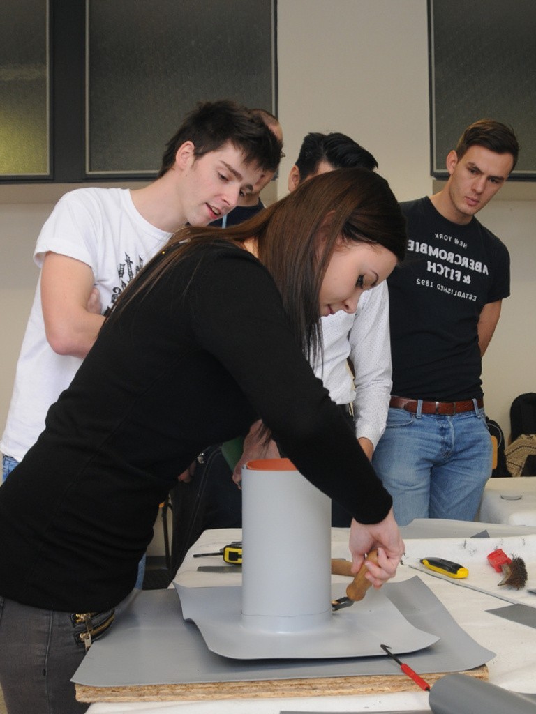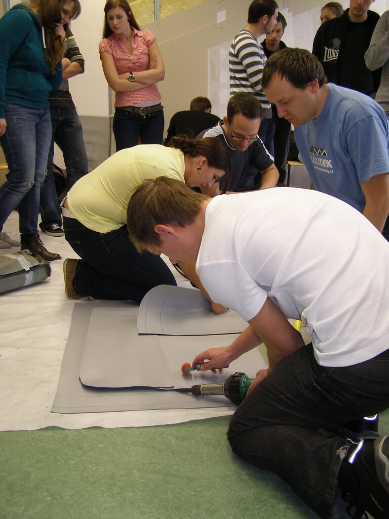 Největší ohlas mají naše přednášky ve spojení s praktickými ukázkami zpracování určitých materiálových skupin. Na takovou formu výuky se výrazně soustřeďuje Katedra technologie staveb Fakulty stavební ČVUT v Praze pod vedením Doc. Ing. Pavla Svobody, CSc. Ten do svých přednášek předmětu Management kontroly staveb již několikrát pozval Ing. Luboše Káně, Ph.D. s výkladem zásad realizace, kontroly provedení a kontroly těsnosti hydroizolačních povlaků a s rozborem příčin poruch hydroizolací. Zájem byl také o výklad principů návrhu a posuzování hydroizolací podle směrnice ČHIS 01 vydané Českou hydroizolační společností ČSSI. Na přednášky Ing. Káně navázala cvičení, kde pražští technici ATELIERU DEK Jan Karásek, Josef Kurka a Ing. Libor Koubek studentům předvedli ukázky zpracování hydroizolačních fólií. Některé z technologických operací si studenti sami vyzkoušeli. Poté si v souladu s náplní předmětu na svých vlastních spojích i na detailech vytvořených našimi techniky sami vyzkoušeli nejobvyklejší metody kontroly provedení a těsnosti. Z fotografií je patrné, že každý měl možnost držet v ruce kromě svařovacího agregátu také kontrolní jehlu i vakuový zvon napojený na vývěvu a každý se podílel na vytvoření a kontrole těsnosti sektoru dvojité hydroizolace. Vyučující hodnotí zapojení našich praktických ukázek do výuky velmi pozitivně. U zkoušek prý studenti odpovídají bez zaváhání i na záludné otázky týkající se technologií a kontrolních metod, které si sami vlastníma rukama „osahali“. A ještě kontrolní otázka: Víte, proč v praktických ukázkách předvádíme zhotovení a kontrolu fóliové hydroizolace a zpracování asfaltových pásů ukazujeme pouze na fotografiích a krátkých videích? Odpověď je snadná, na pražské stavební fakultě je velmi citlivé požární zabezpečení, a to samozřejmě nerozlišuje zdroj kouře nebo tepla. Vůbec nestojíme o osprchování samočinným hasicím zařízením v průběhu výuky.