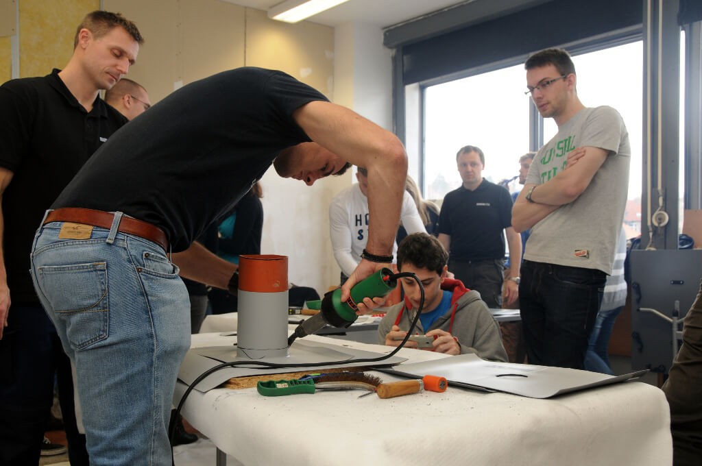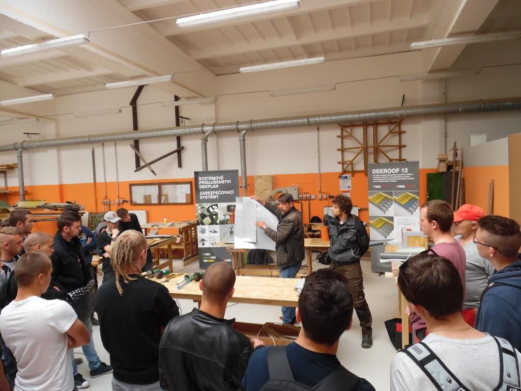 Nutno ale dodat, že budoucí zhotovitele, kteří vyjdou například ze SOU Bosonohy nebo SOU a SOŠ Vyškov, nenachytají. Ti si s velkým zájmem vyzkoušeli svařování hydroizolačních fólií DEKPLAN a opracování střešních detailů pod dohledem našeho školitele Roberta Mráčka a teoretickou “nalejvárnu” dostali od brněnských techniků Ing. Roberta Kokty a Ing. Martina Klimeše. Na obou učilištích jsme byli pozitivně překvapeni velmi aktivním přístupem posluchačů k praktickým ukázkám, svařovací agregáty šly z ruky do ruky.