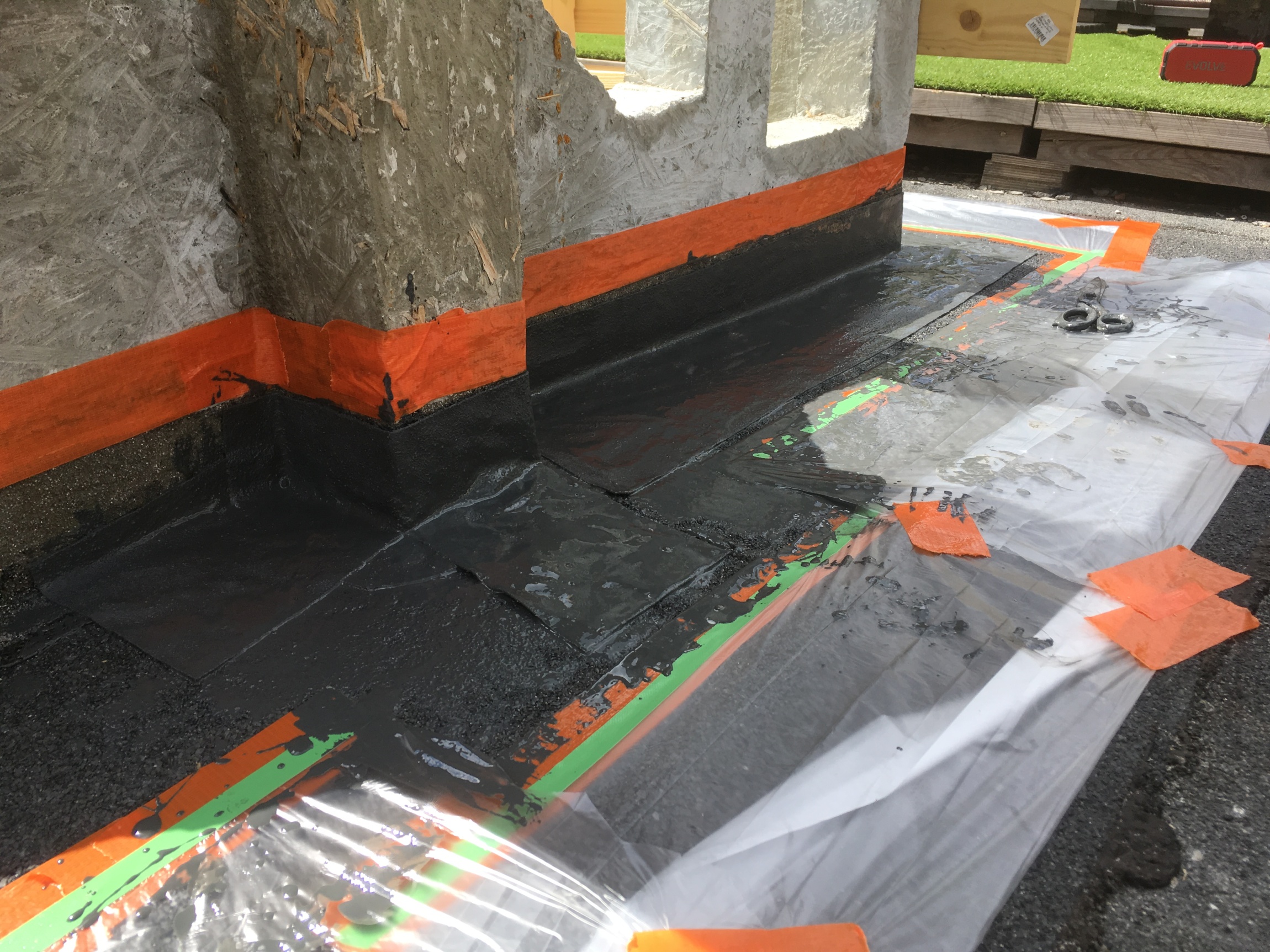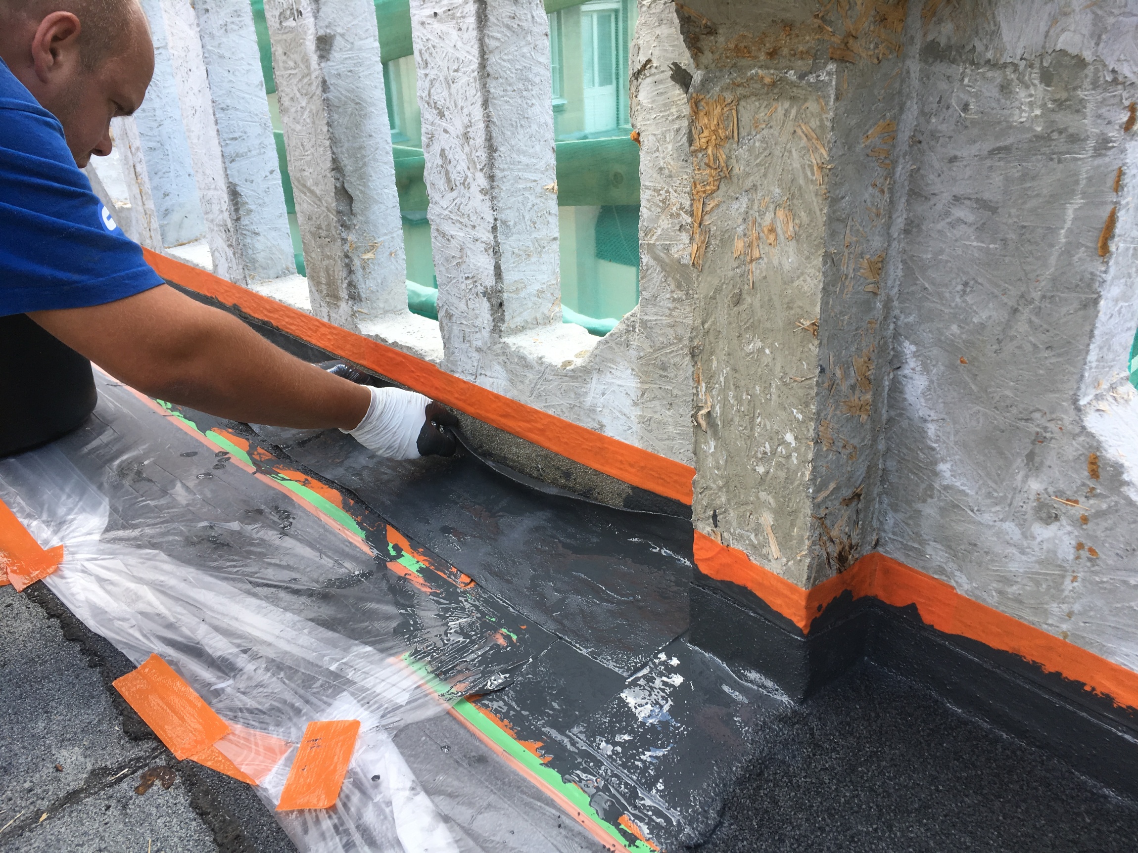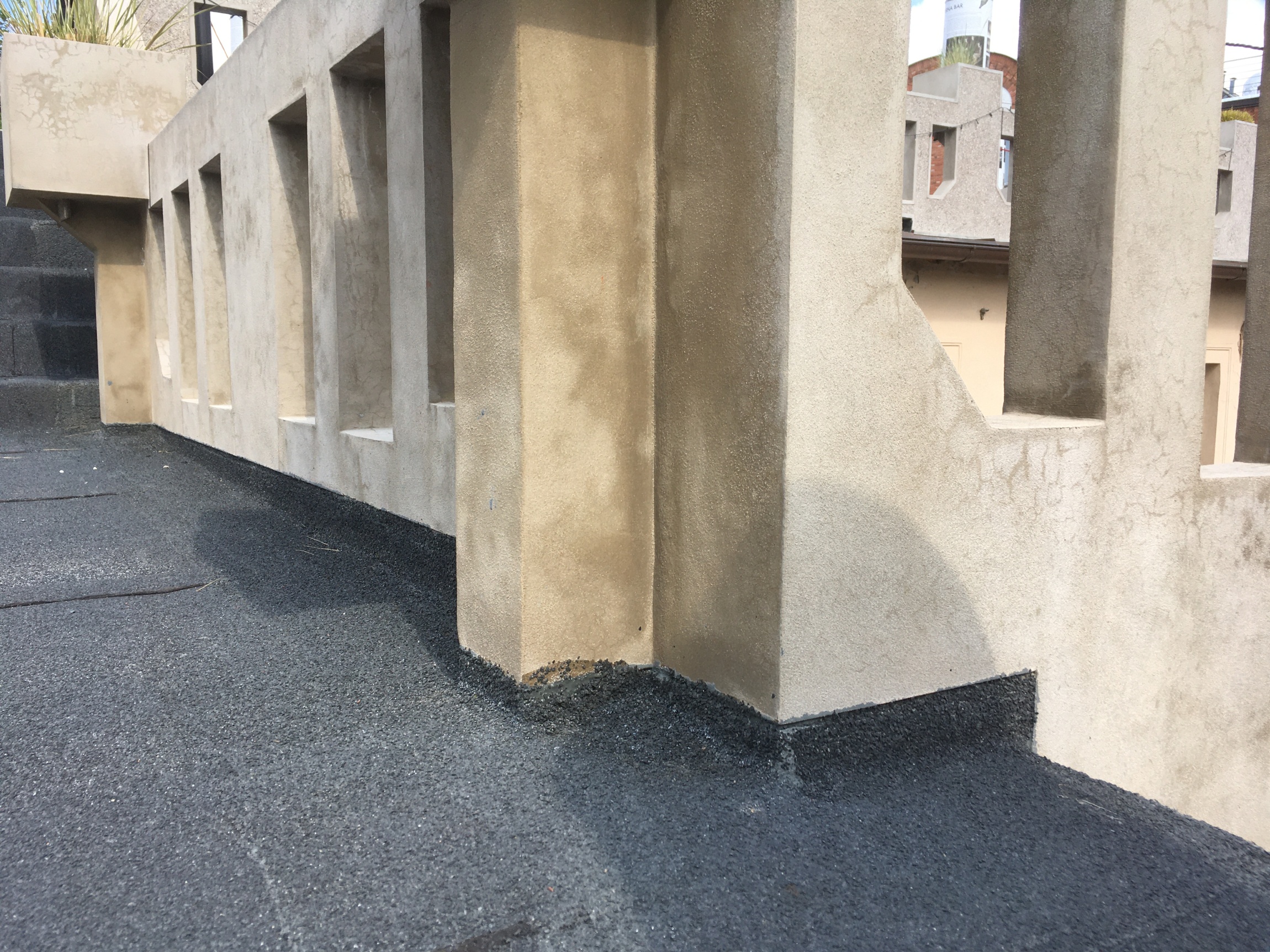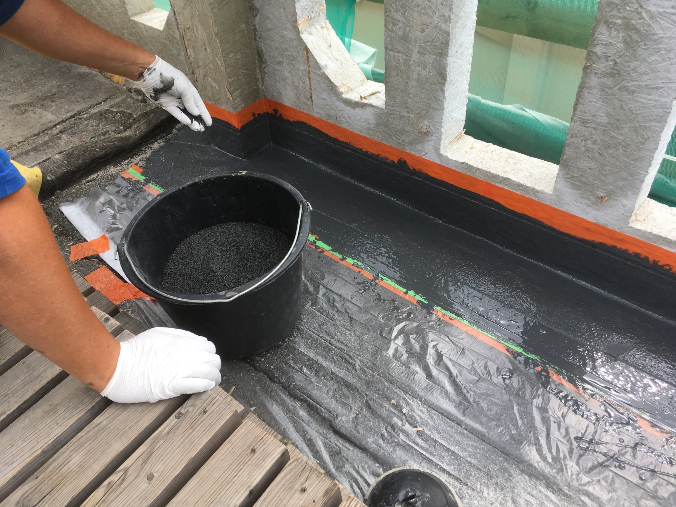 Obecně máme dobrou zkušenost se stěrkovými systémy na bázi polyuretanu. Vedle dobré životnosti je jejich velkou předností v porovnání s jinými osvědčenými materiálovými bázemi absence výrazného zápachu při provádění. Pro konkrétní aplikaci jsme nechali 2 dodavatele polyuretanových systémů provést vzorek přímo na terase. Pro realizaci byl nakonec zvolen systém Kemperol 2K PUR prováděný na vyspravený podklad betonového zábradlí, resp. povrch nových asfaltových pásů. Podklad je v obou případech ošetřený systémovou penetrací Kempertec, na svislém betonovém podkladu je do penetrace proveden vsyp křemičitým pískem pro dosažení kvalitnější přídržnosti stěrky.