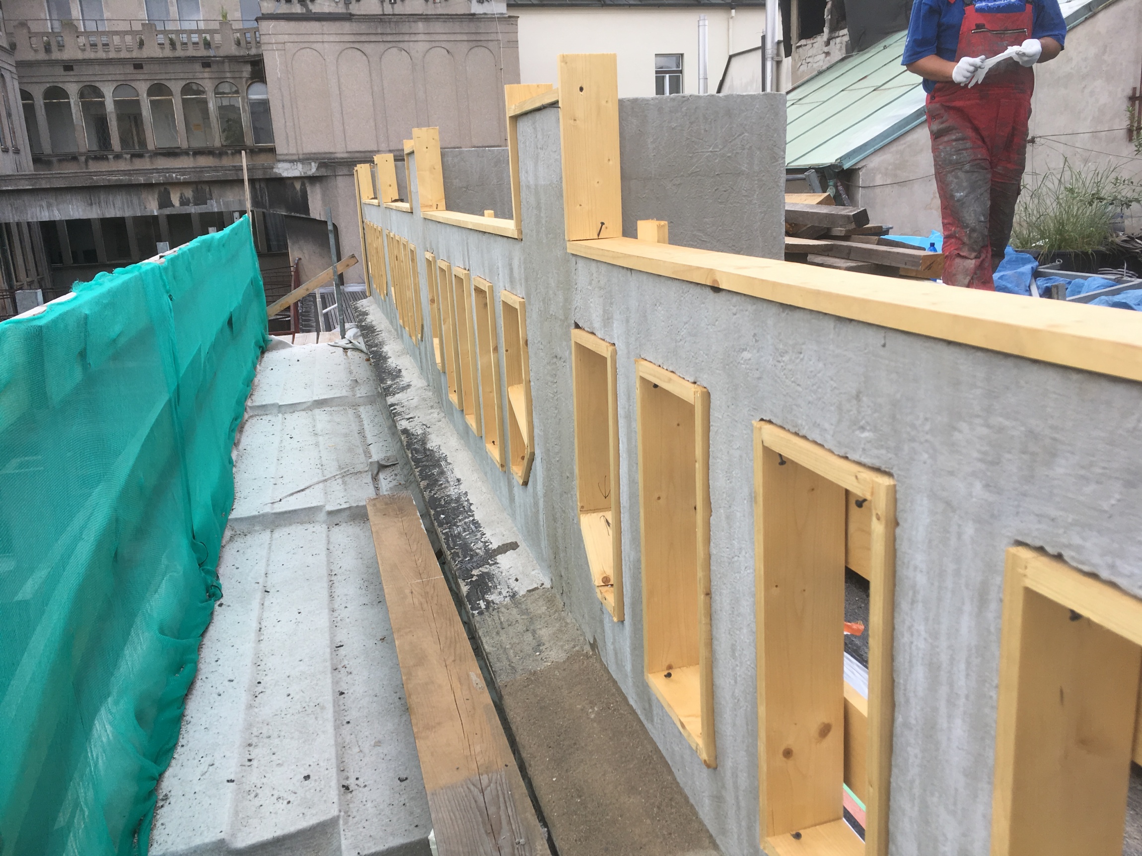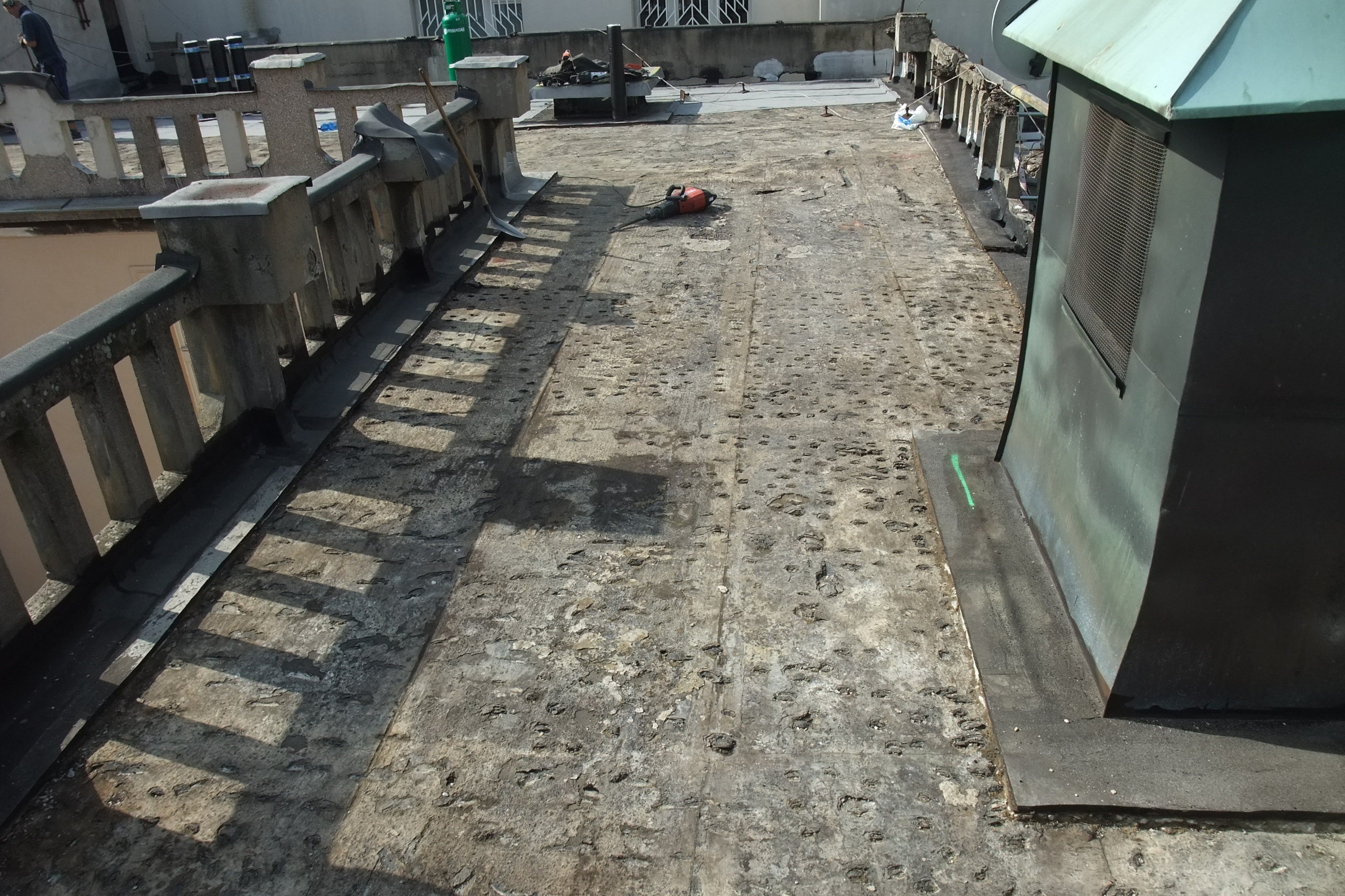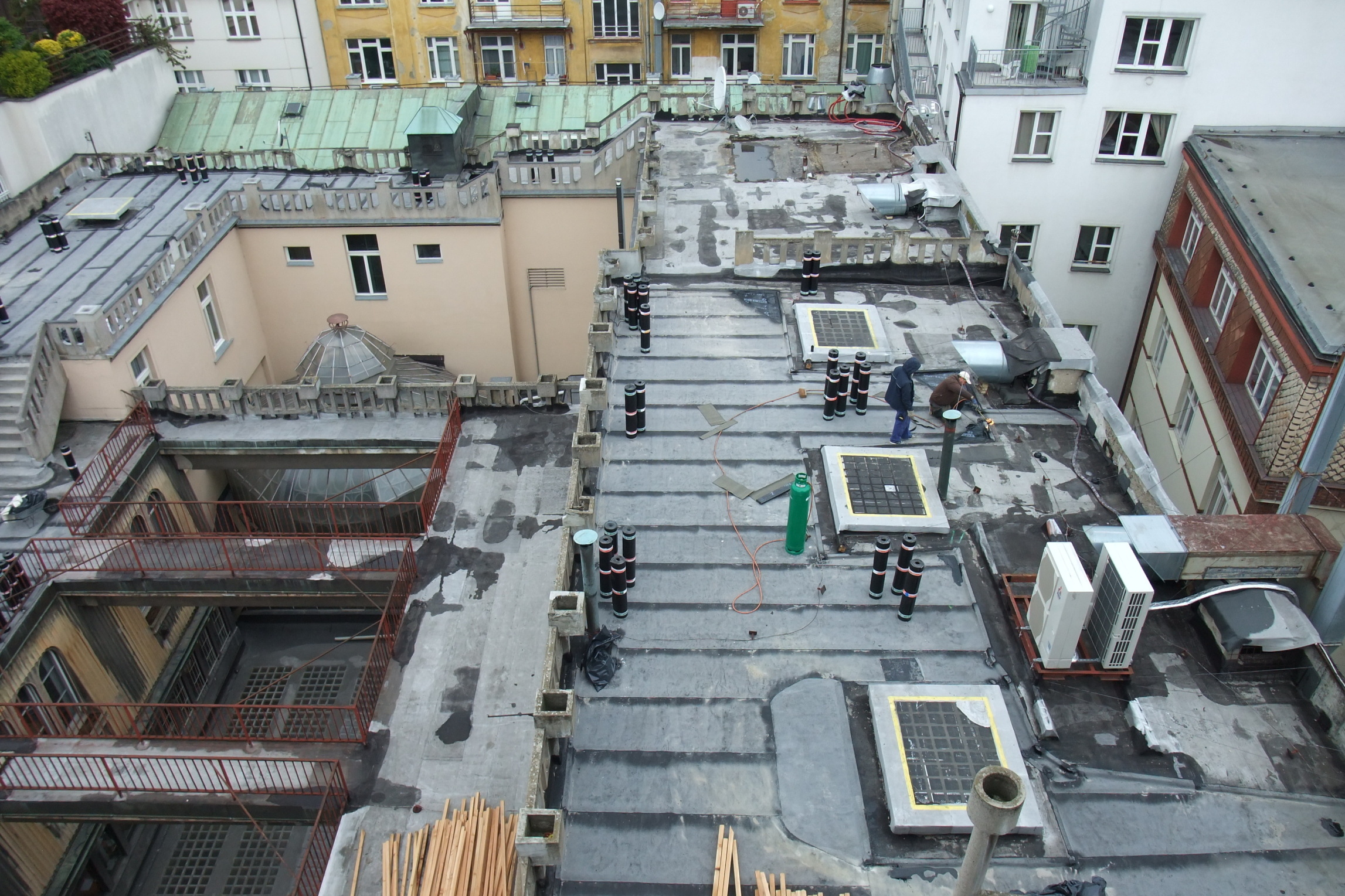 Následně bylo možné důkladněji vyrovnávat povrch střechy už bez většího rizika zatečení do souvrství teras a interiéru paláce. Vyrovnání se provádělo vrstvením přířezů asfaltových pásů, případně rozehřátým asfaltem. Cílem bylo vyloučit vznik kaluží na finálním povrchu hydroizolace teras.