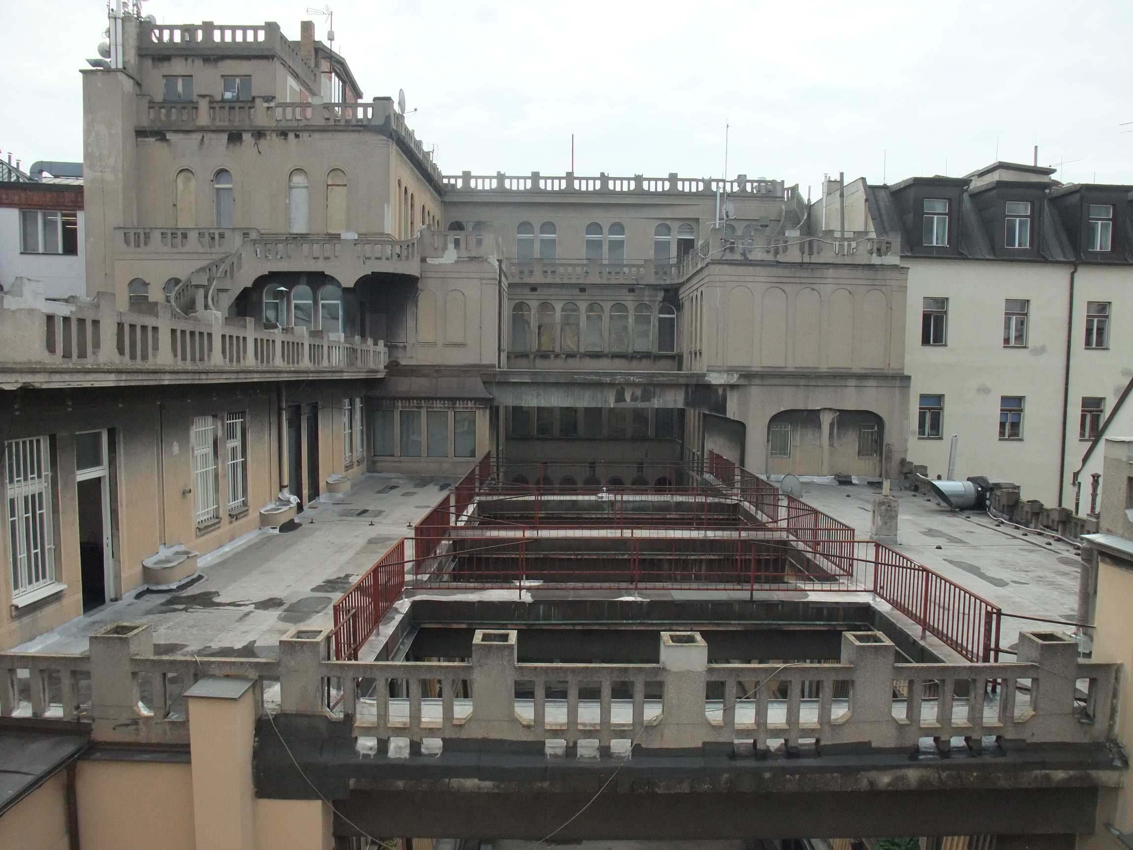 Sondami jsme zjistili, že souvrství teras tvořil hubený škvárobeton ve spádu, na jehož povrchu byla provedena vyztužená betonová mazanina s hlazeným povrchem. V místech, kde byla ve spádu už samotná nosná stropní konstrukce, škvárobeton nebyl. Následovala hydroizolace z asfaltu zpracovaného za horka s vloženou textilní výztuží. Střešní plochy jsou odvodněné skrz otvory v železobetonovém zábradlí do podokapních žlabů.