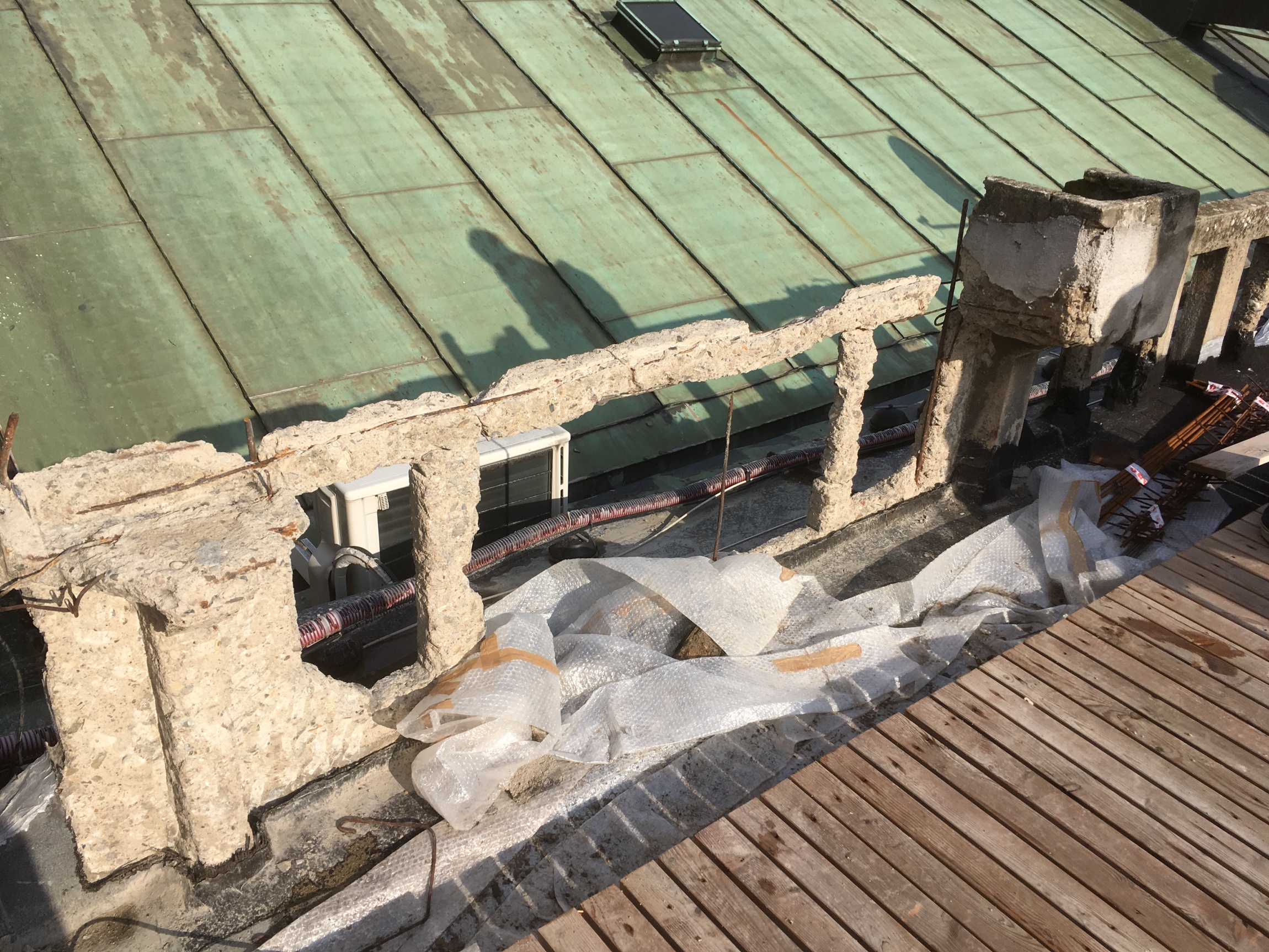 Na železobetonové konstrukci se podepsal zub času a absence jakékoliv údržby od doby výstavby paláce. Zdobné květníky byly z větší části rozpadlé, beton sloupků je již hloubkově zkarbonatovaný a korodující výztuž nabýváním svého objemu roztrhla mnohé subtilní prvky zábradlí.
