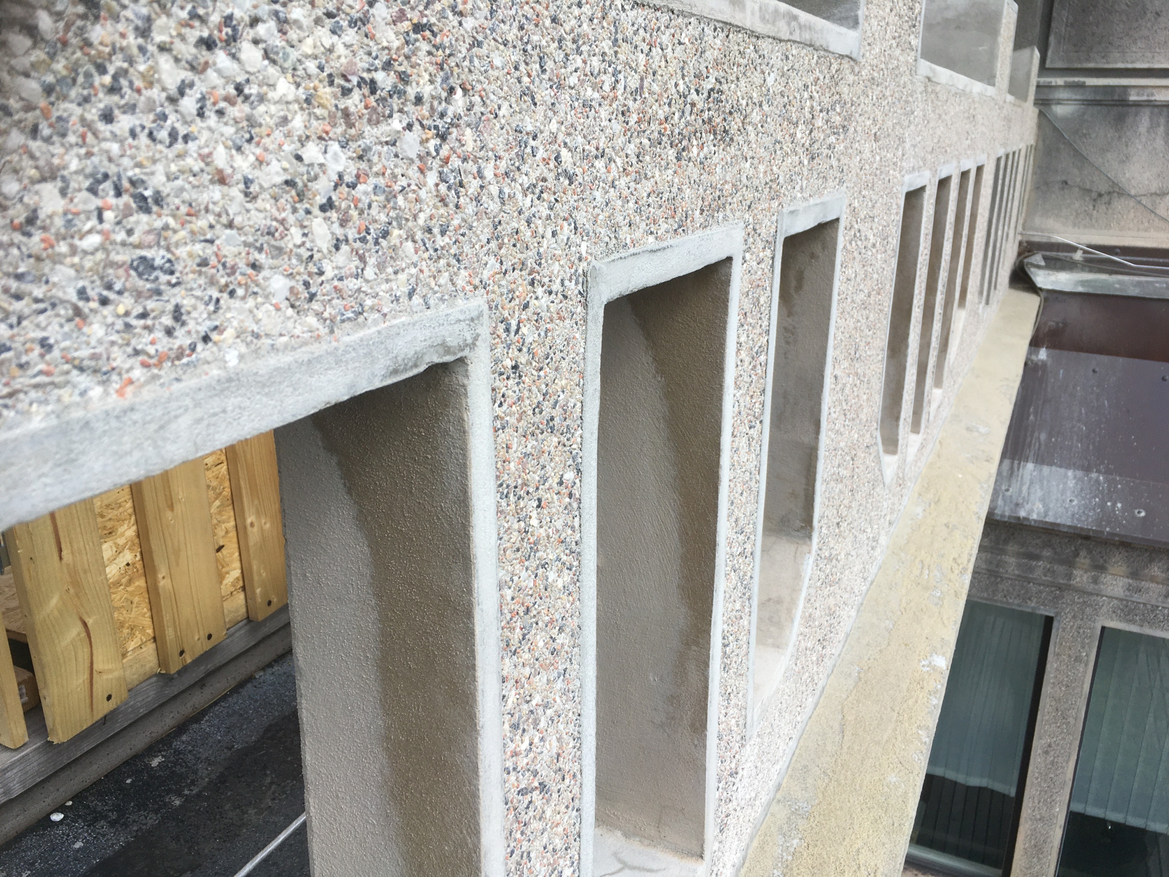 Nové květníky jsou vyloženy nerezovým plechem. Povrch zábradlí je následně z obou stran omítaný. Z vnitřní strany zábradlí se provádí tradiční hlazená lehce probarvená omítka, z fasádní strany pak technologicky náročná pemrlovaná teracová omítka. Omítky musely být nejprve vyvzorkovány s památkáři – u vnitřní strany hlazené omítky odstín, u vnější teracové pak směs (barevnost) a frakce kameniva.