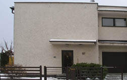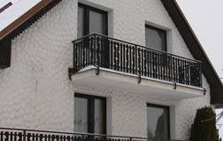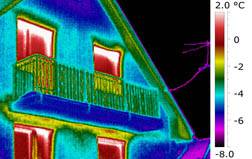 Obr. 02 Tepelně se propisující balkónový nosník. Na štítové stěně patrný rozdíl mezi vytápěnou a nevytápěnou částí, což poukazuje na horší tepelněizolační vlastnosti zdiva.