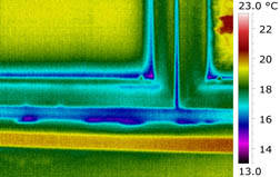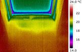 Obr. 08 Dožilá dřevěná okna. Při podtlaku jsou patrné snížení povrchové teploty v úrovni připojovací a funkční spáry okna