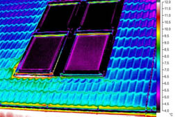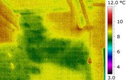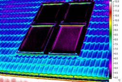 Obr. 09 Vikýř, snížené povrchové teploty patrné již při přirozeném tlakovém rozdílu, při podtlaku se nevzduchotěsná místa více propsala