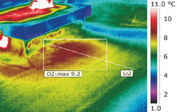 Na termovizním snímku /obr. 11/ je patrné proudění vzduchu z interiéru na straně komory vzduchotechniky. Obrazec O1 znázorňuje nejvyšší teplotu v oblasti vedle komory. Obrazec O2 znázorňuje charakteristickou teplotu střešního pláště. Z porovnání povrchových teplot z obrazců O1 a O2 je zřejmé, že teplota vedle komory je cca o 5,5°C vyšší než na charakteristické ploše střešního pláště.