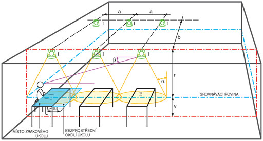 Udržovaná osvětlenost se posuzuje jak v místě zrakového úkolu, tak také v bezprostředním okolí úkolu, které je tvořeno pásem o šířce nejméně 0,5 m okolo místa zrakového úkolu (obr. 01), ale pouze uvnitř zorného pole tab. 02.