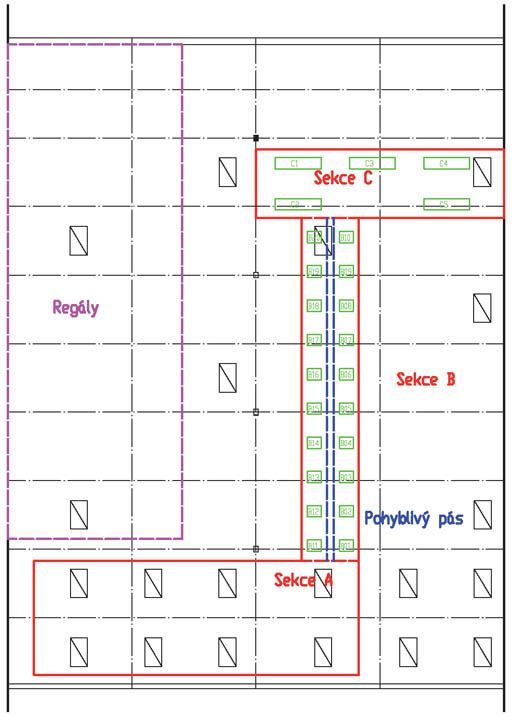 V jižní části haly, kde je kumulováno více světlíků, jsou ale splněny požadavky na sdružené osvětlení dle ČSN 36 0020. Při sdruženém osvětlení je možno u rekonstrukcí a modernizací místa trvalého pobytu umístit i tam, kde je nižší úroveň denního osvětlení (zpravidla 30 % požadované hodnoty denního osvětlení), ale pouze za předpokladu doplnění vyhovujícího umělého osvětlení. Práce na třídicí lince je technologicky členěna do třech etap. Časově nejnáročnější je část příjmu, rozbalování, hrubého třídění, práce s odpady a recyklace, která byla umístěna do jižní části Expertní a znalecká kancelář haly – sekce A. Časově méně náročné dotřiďování a balení jsou ve střední části (sekce B) a severní části (sekce C) haly, viz obr. 03. Na lince může najednou pracovat max. 20 osob, které se v jednotlivých sekcích střídají.