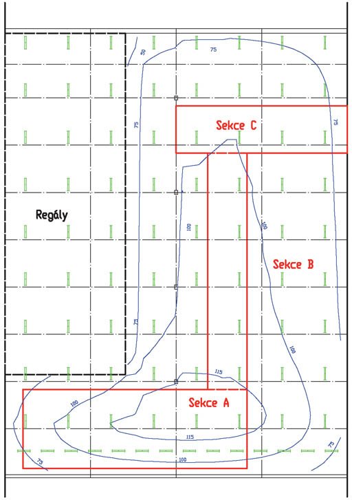 sekce A: 3 řady po 8 ks svítidel umístěných ve výšce 4,0 m nad podlahou