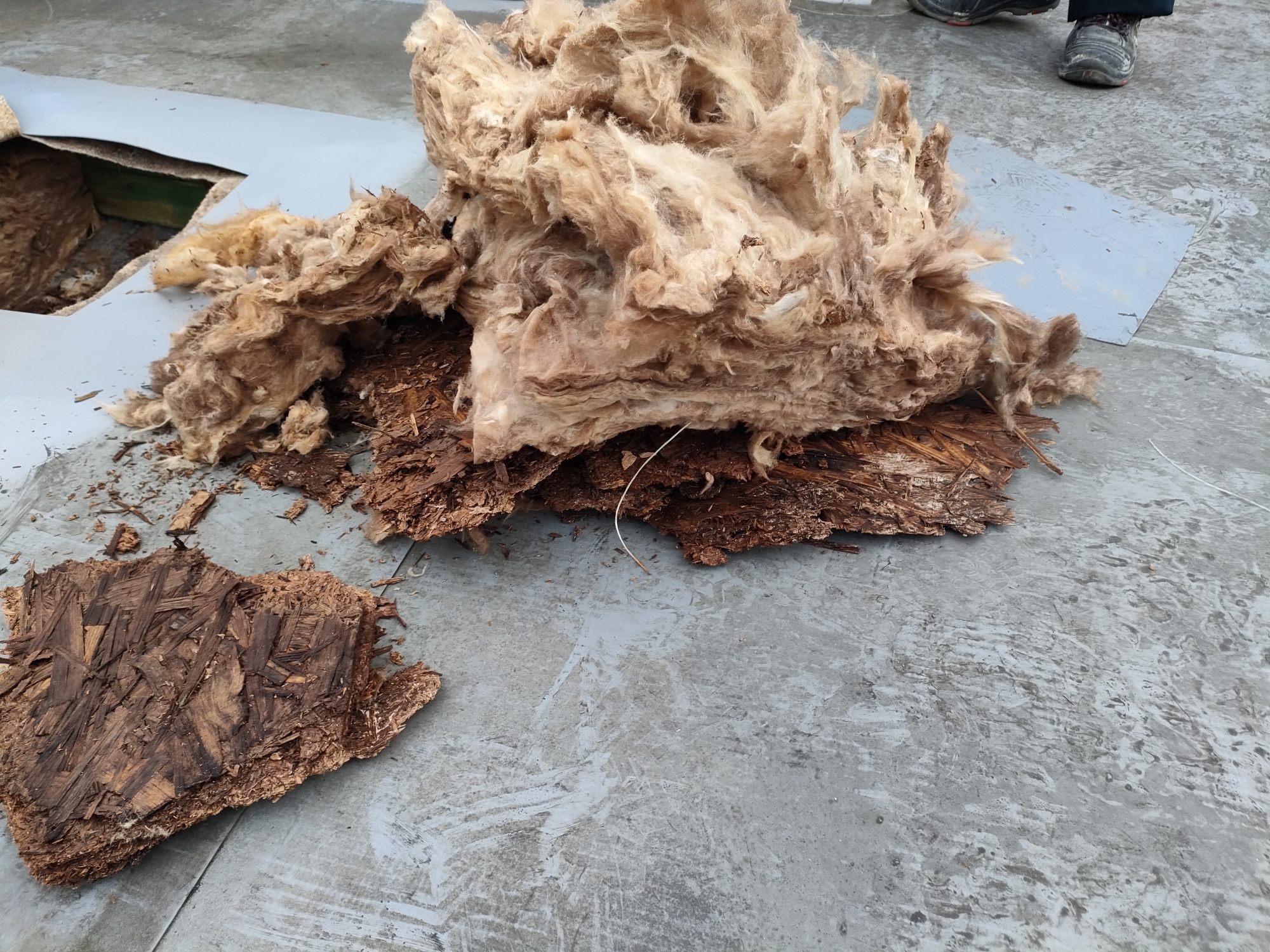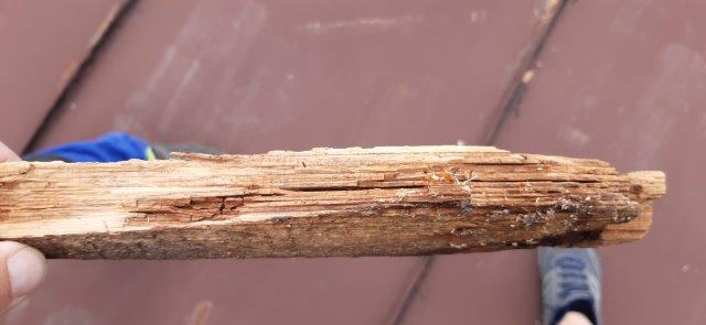 V tomto případě se na havarijní stav střechy přišlo v souvislosti se záměrem instalovat na střechu fotovoltaické panely. Indikátorem byl nadměrně se prohýbající záklop z OSB desek, tvořící podklad pro hydroizolaci. Hned v první sondě se ukázalo, že je shnilý (Obr. 1).