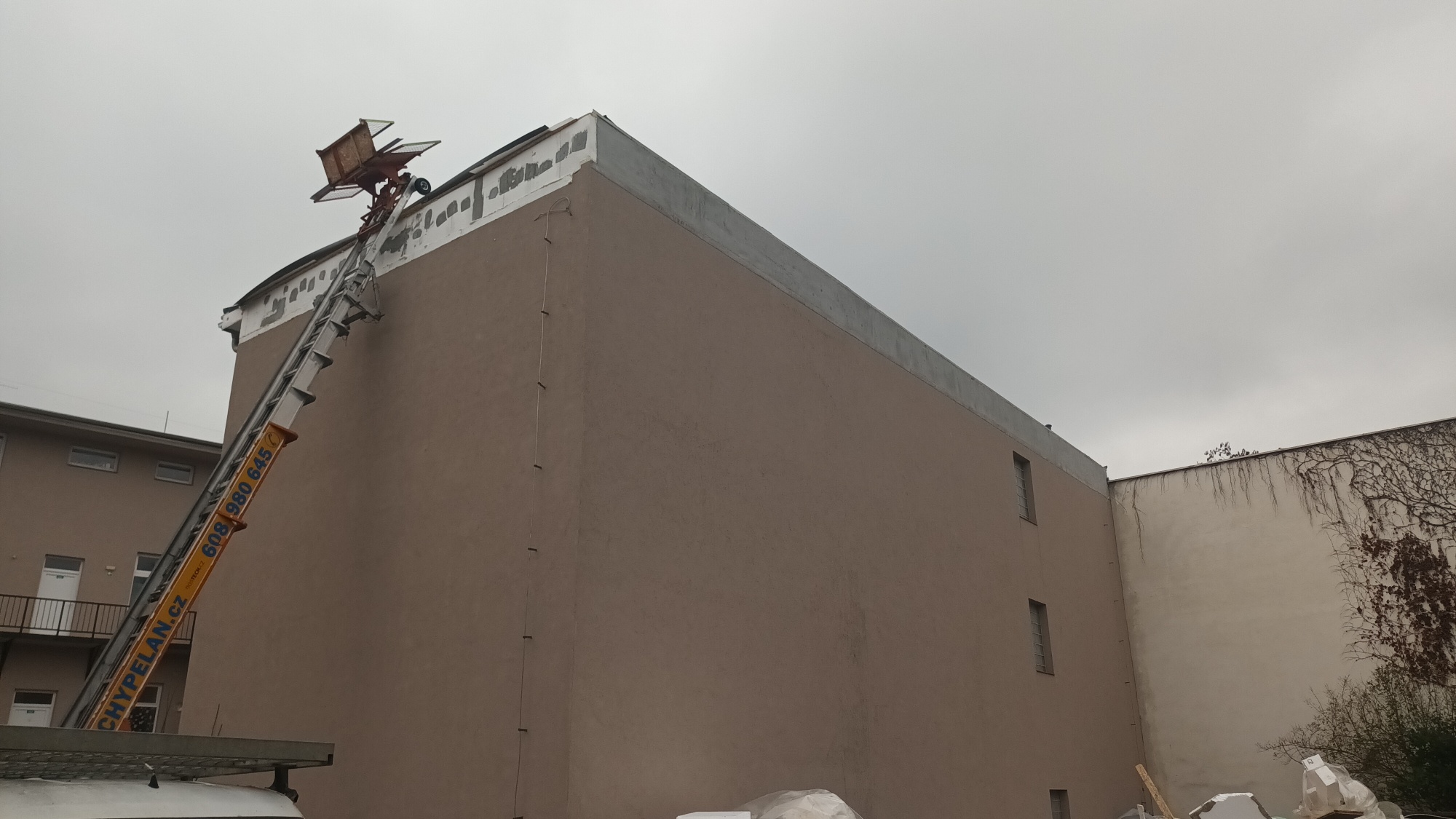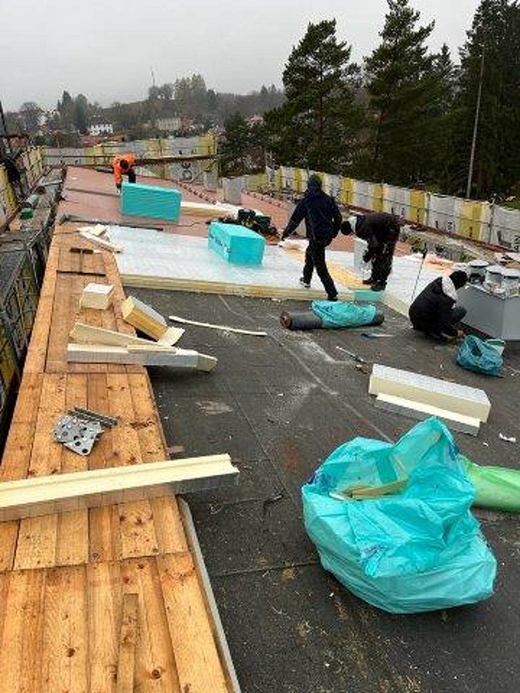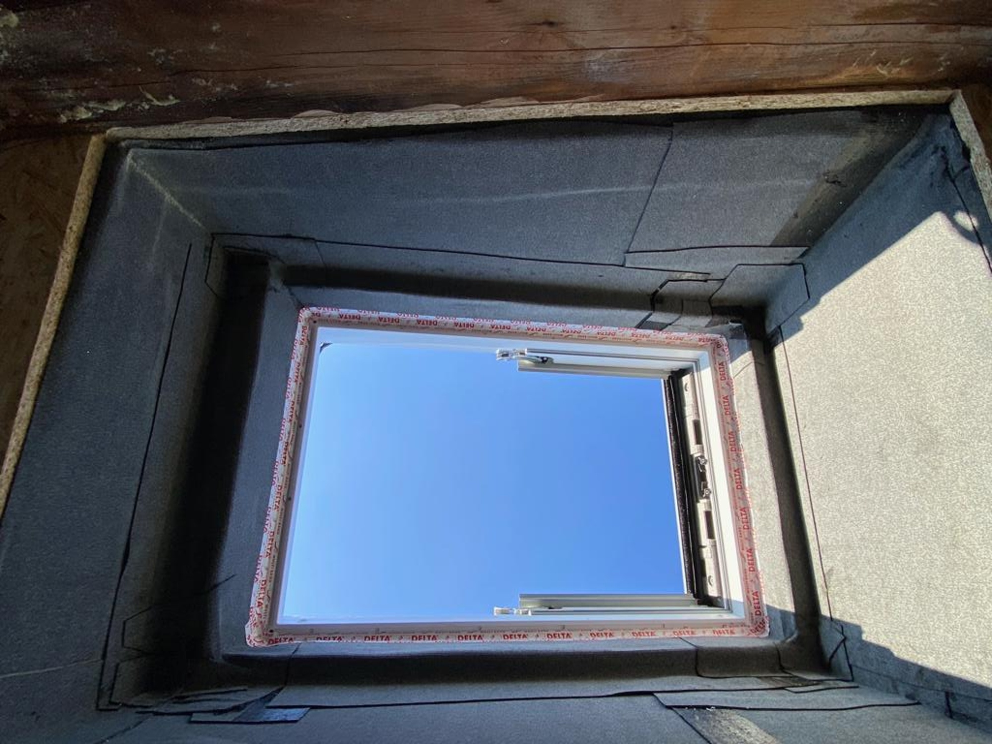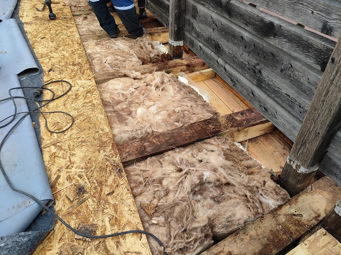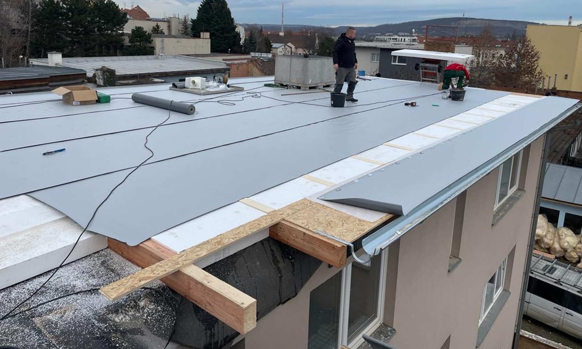 Pro opravu střechy byla zvolena nadkrokevní skladba odpovídající Dekroof 07 (ST.1007) s parozábranou, tepelnou izolací a hydroizolací na novém záklopu připevněném k ošetřeným původním krokvím. Toto řešení při rekonstrukci umožňuje dostatečně spolehlivě hydroizolačně zabezpečit etapovou spáru mezi starou a novou skladbou (původní hydroizolace se dočasně propojí s novou parozábranou z asfaltových pásů). Nová parozábrana je sice ze samolepicího asfaltového pásu Glastek 30 Sticker Plus, ale při realizaci rekonstrukce v lednu bylo třeba pás nahřívat horkým vzduchem, aby spoje byly kvalitní.