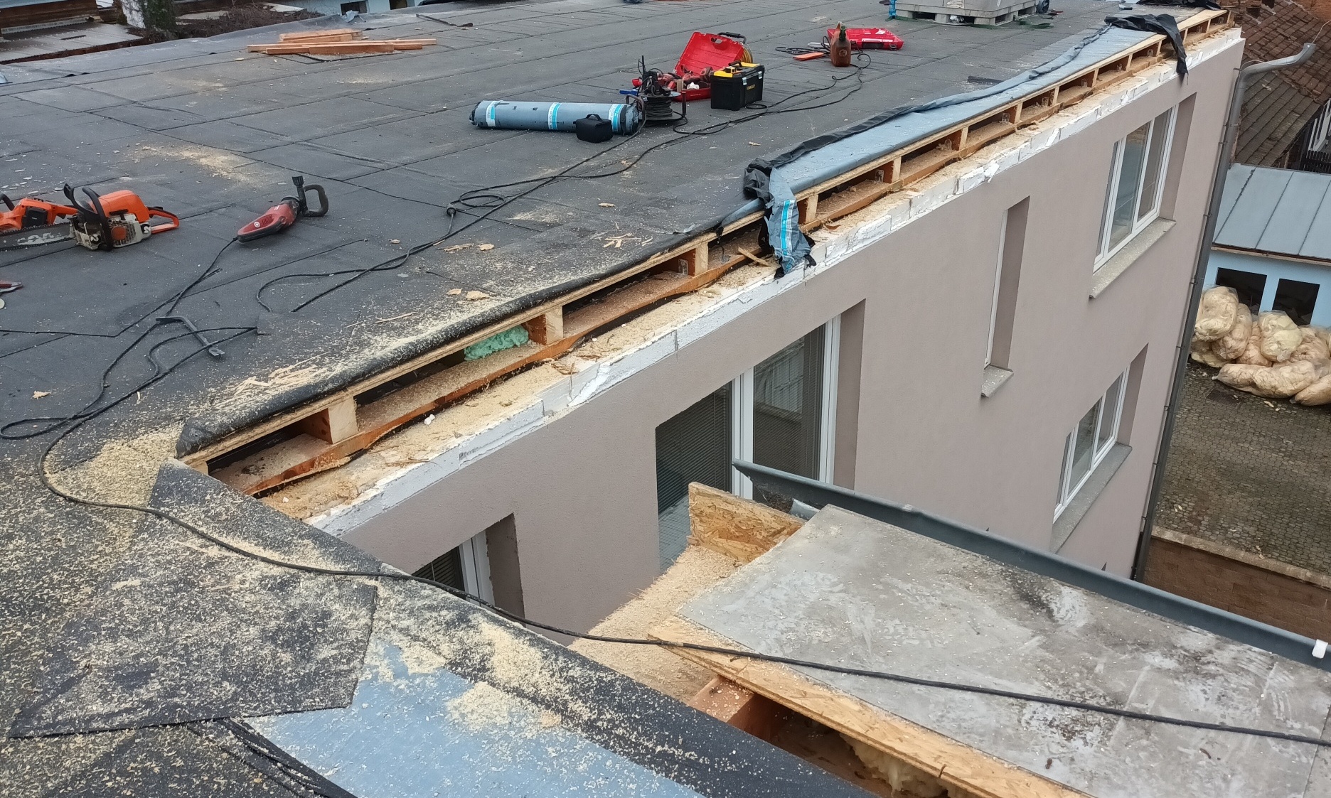 Pro zajištění vzduchotěsnosti okraje střechy byly odřezány původní přesahy střechy tvořené průběžnými krokvemi. Byla snaha se co nejvíce přiblížit systémovým detailům pro skladbu Dekroof 07 (www.dekpartner.cz).
