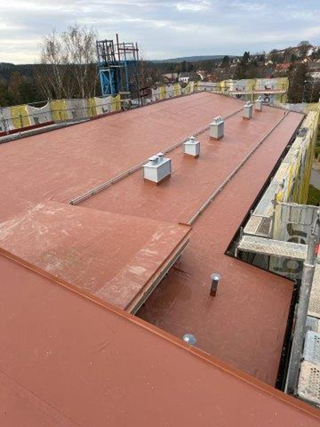 Nefunkční skladba ploché střechy byla provedena se zateplením mezi krokvemi, bez větrání pod záklopem a s povlakovou hydroizolací. Parozábrana z lehké fólie byla provedena zespodu spolu s podhledem.