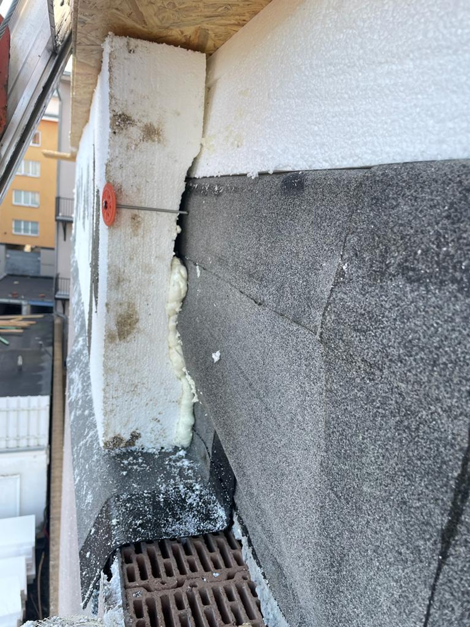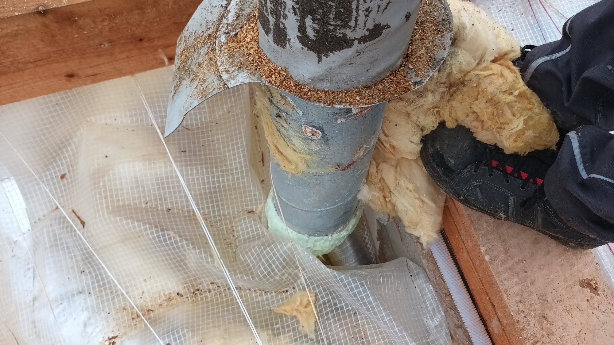 Z výše uvedených fotografií je patrné, že kromě nevhodně řešených příček a stěn z dutinových cihel bez uzavření koruny věncem jsou zdrojem vlhkosti pronikajícící do střešní skladby netěsnosti v parozábraně. Nejrizikovějšími místy ohrožujícími parotěsnost a vzduchotěsnost fóliové parozábrany jsou prostupy instalací, které provedli nejspíš pracovníci jiných řemesel až po sádrokratonářích. Bohužel se s neúctou (nebo snad ignorací z neznalosti souvislostí) jednoho řemesla k práci předcházejícího řemesla na stavbách setkáváme velmi často. A technický dozor buď není pro stavbu sjednán nebo nepůsobí na stavbě v dostatečném rozsahu.